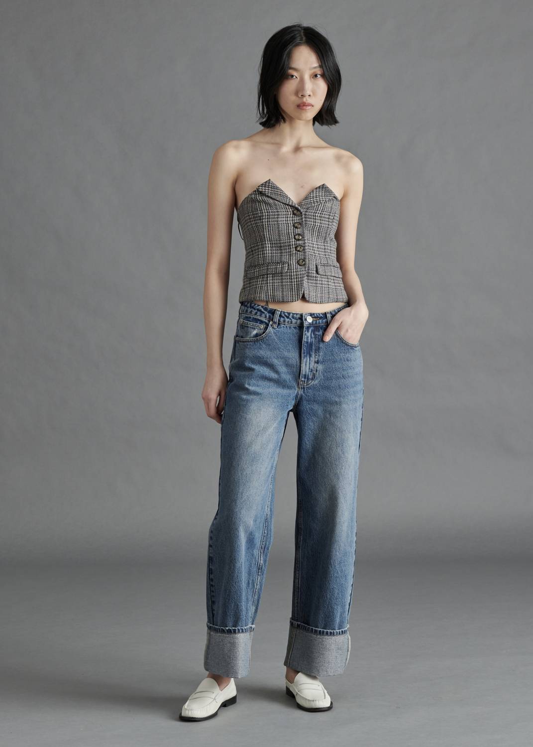 Um punho profundo acrescenta um estilo moderno a jeans resistentes com pernas largas e levemente largas, feitos em uma lavagem desbotada clássica.