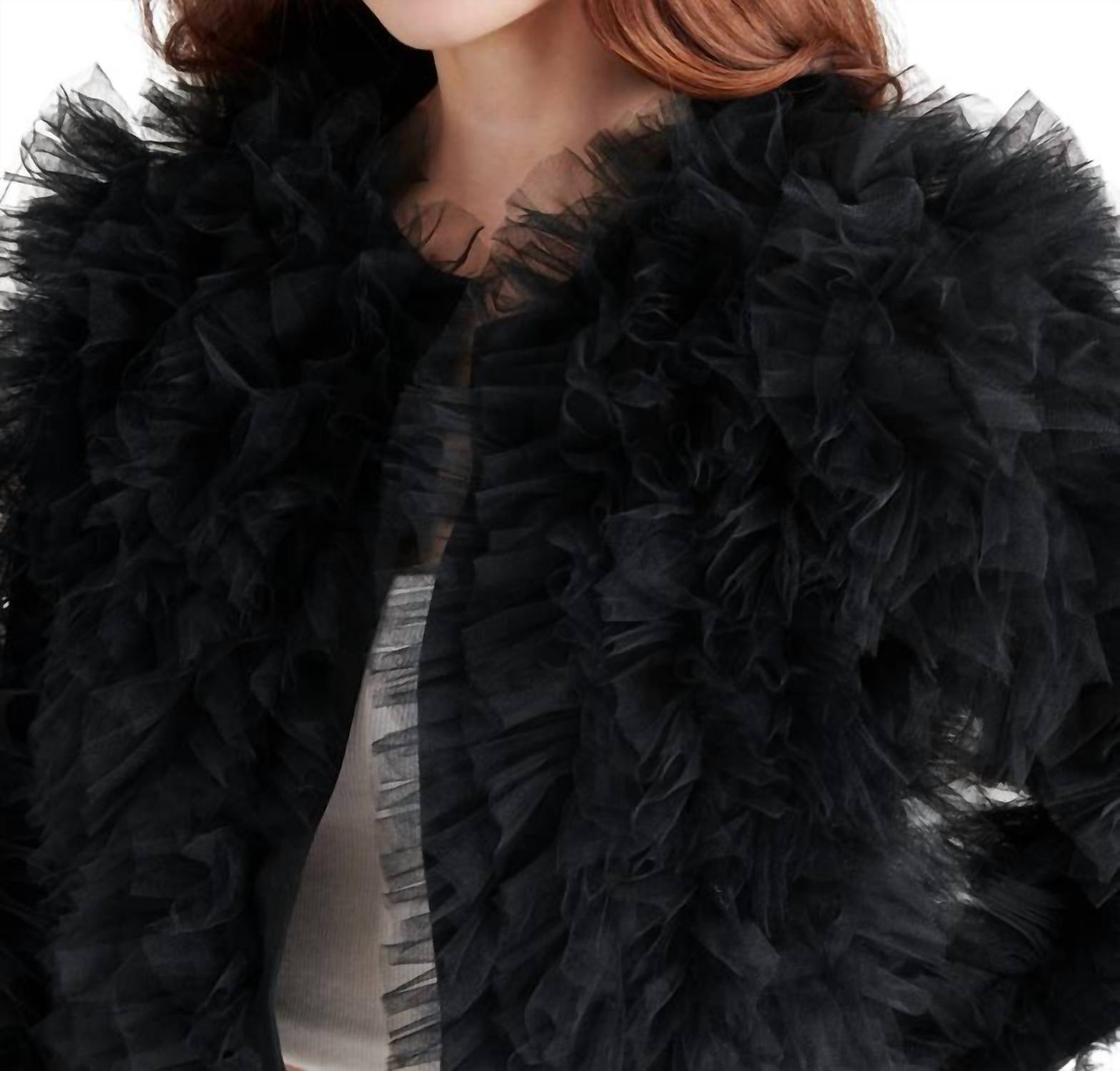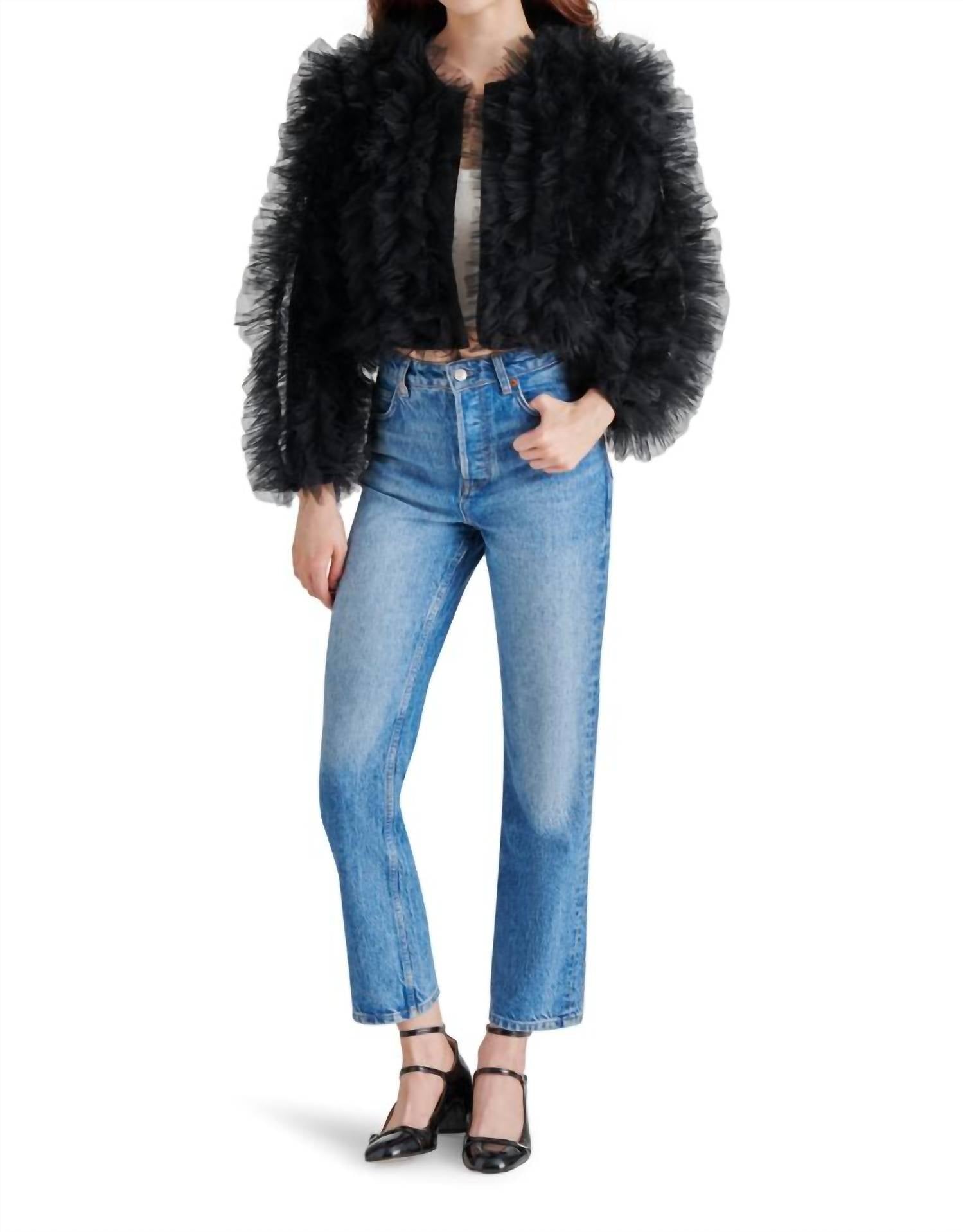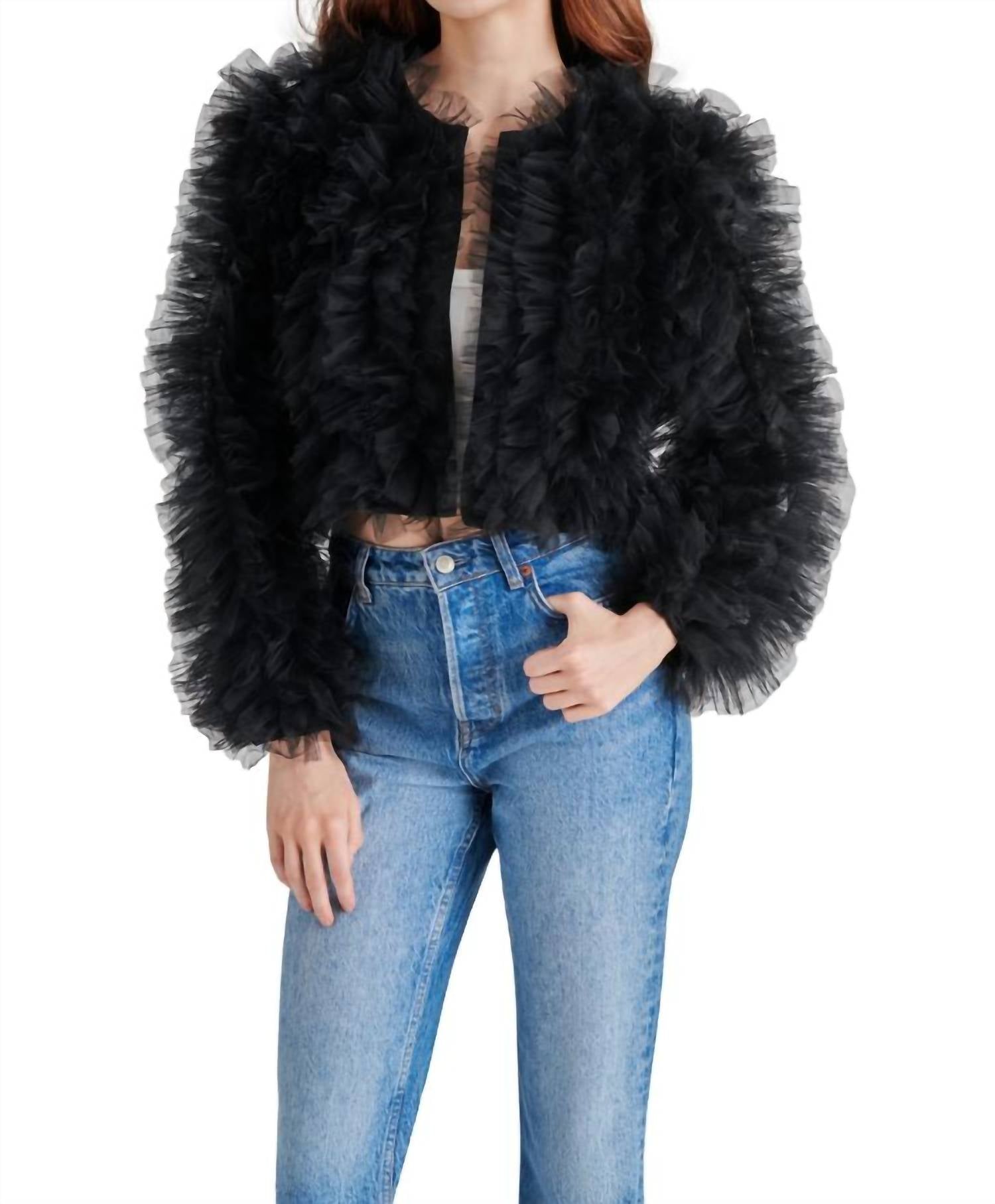 Cute, casual, and comfortable. This jacket is a must have. Introducing the Steve Madden Odile Ruffled Tulle Jacket, an 18" long casual jacket that makes a bold statement. This black, collarless design features long sleeves and a hook-and-eye front closure, with allover textured ruffled tulle for a maximalist appeal. Made from 100% polyester with a matching lining and finished with convenient side pockets, it's crafted to add flair to your winter or holiday wardrobe. Care is simple: wipe clean only. Imported for stylish music festivals and festive gatherings.