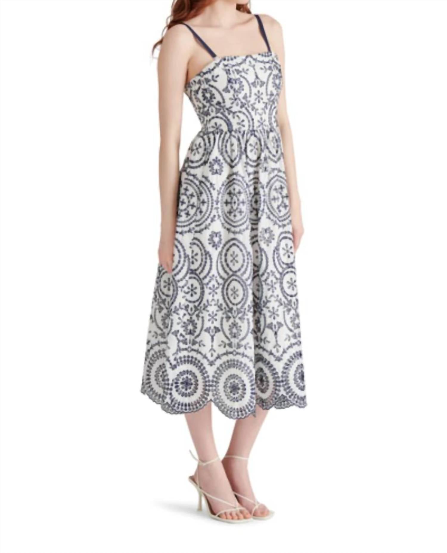 Discover the Shirley Dress by Steve Madden, an elegant piece in a vibrant marine color, perfect for a stylish summer beach day. This strapless dress includes removable straps for versatile wear and features practical side pockets, along with a scalloped hem for a touch of whimsy. Its midi length showcases a classic A-line silhouette with a stylish squareneck. Closure: Zip closure.