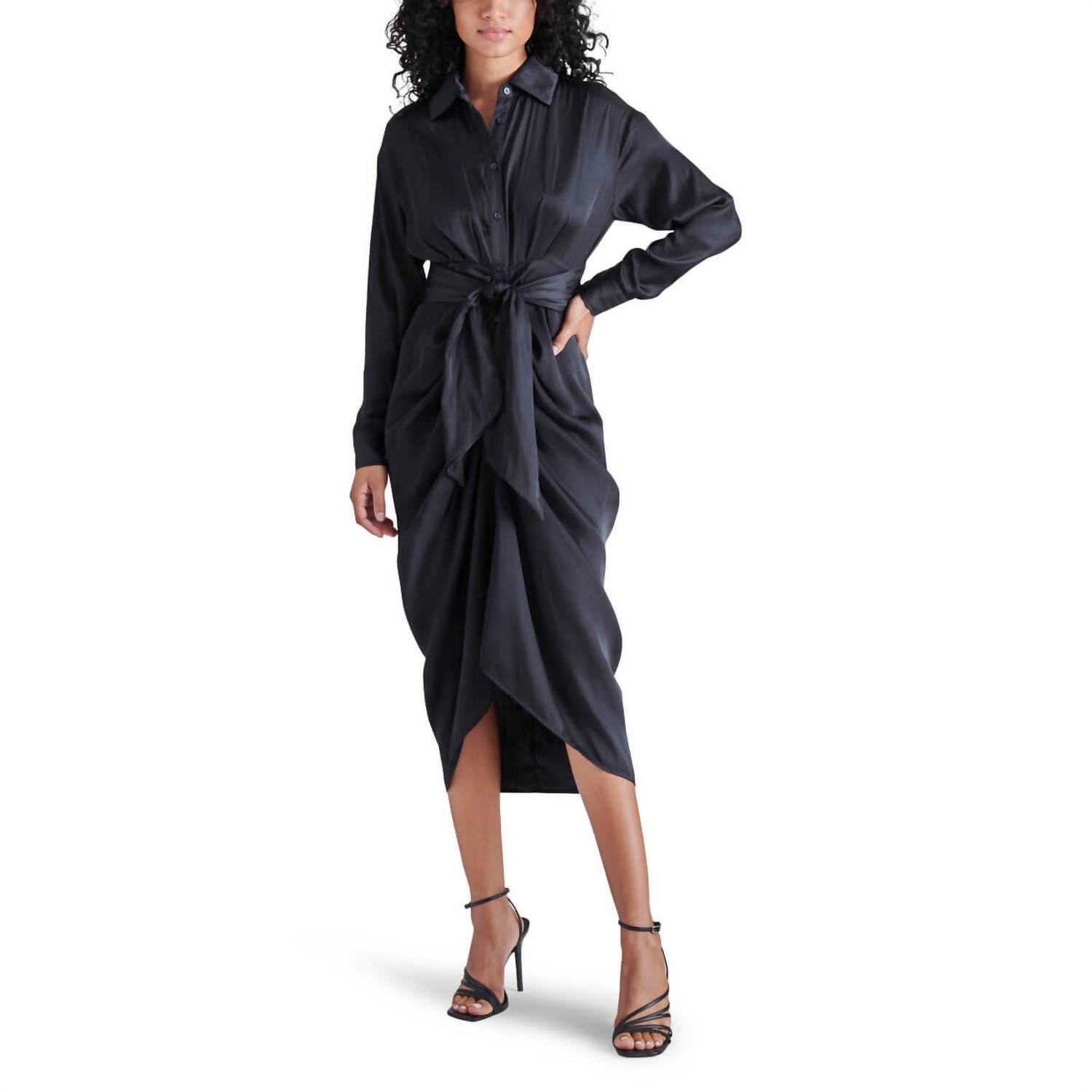 O vestido com o comprimento perfeito existe. Este vestido-camisa apresenta um franzido frontal com amarração e saia assimétrica. Vestido-camisa drapeado. Fecho frontal com botões. Gola V com gola alta. Mangas compridas com punho abotoado. Cintura ajustável franzida frontal com amarração. Bainha assimétrica. Acabamento acetinado lavado. Comprimento: 41". 100% poliéster. Instruções de cuidado: lavar à mão com água fria separadamente. Importado.