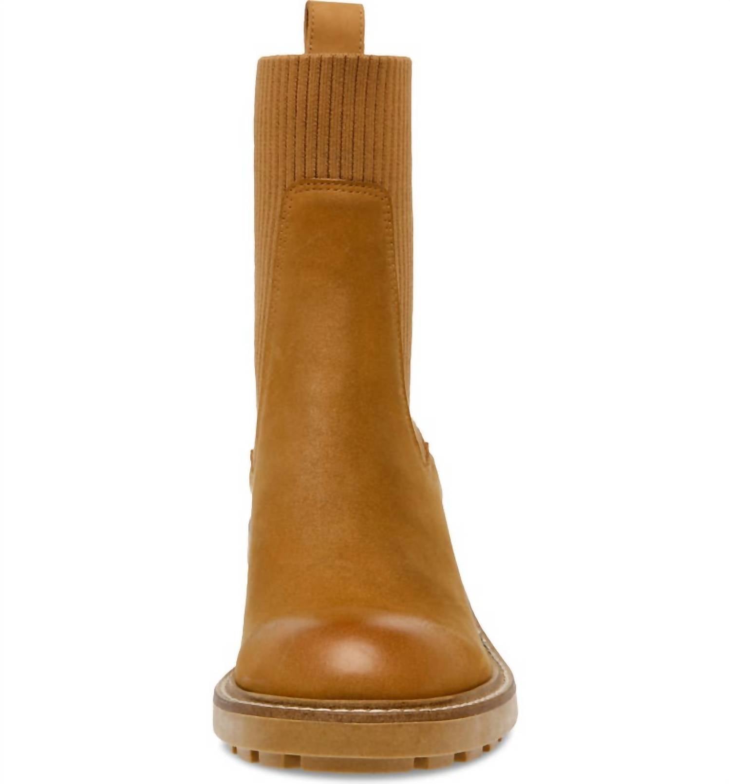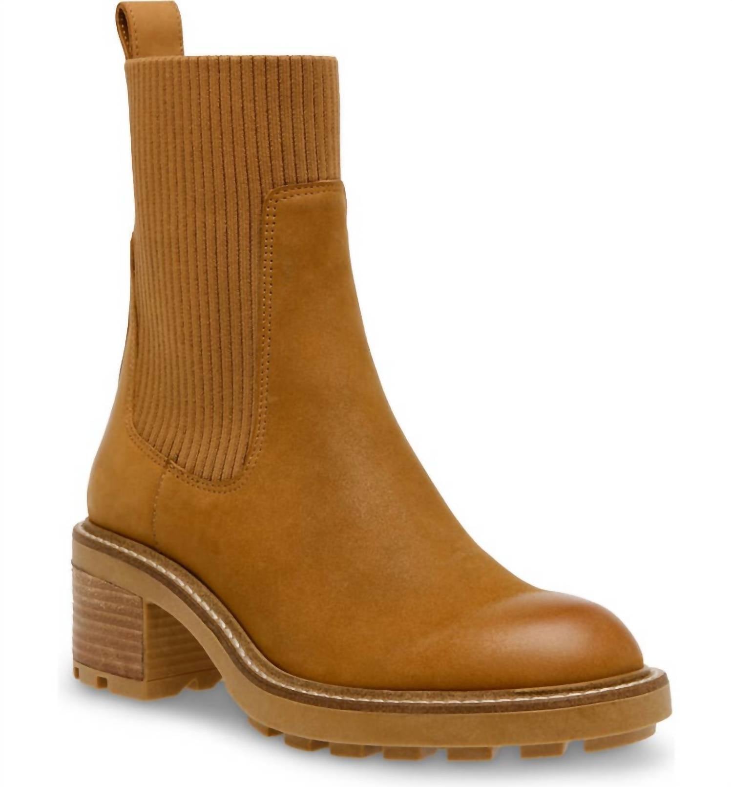 Step into style with the Women's Kiley Leather Sock Chelsea Boots by Steve Madden, showcasing a camel hue and utilitarian lug sole for an effortlessly chic look. These boots feature a 2" chunky heel and a 1/2" platform, providing comfort and elegance for any occasion, especially a dinner party. With a 7" shaft, round toe shape, and crafted from leather with a textile lining and synthetic sole, these minimalist boots are perfect for the spring season. Imported and true to size, they promise a seamless fit for every stride.