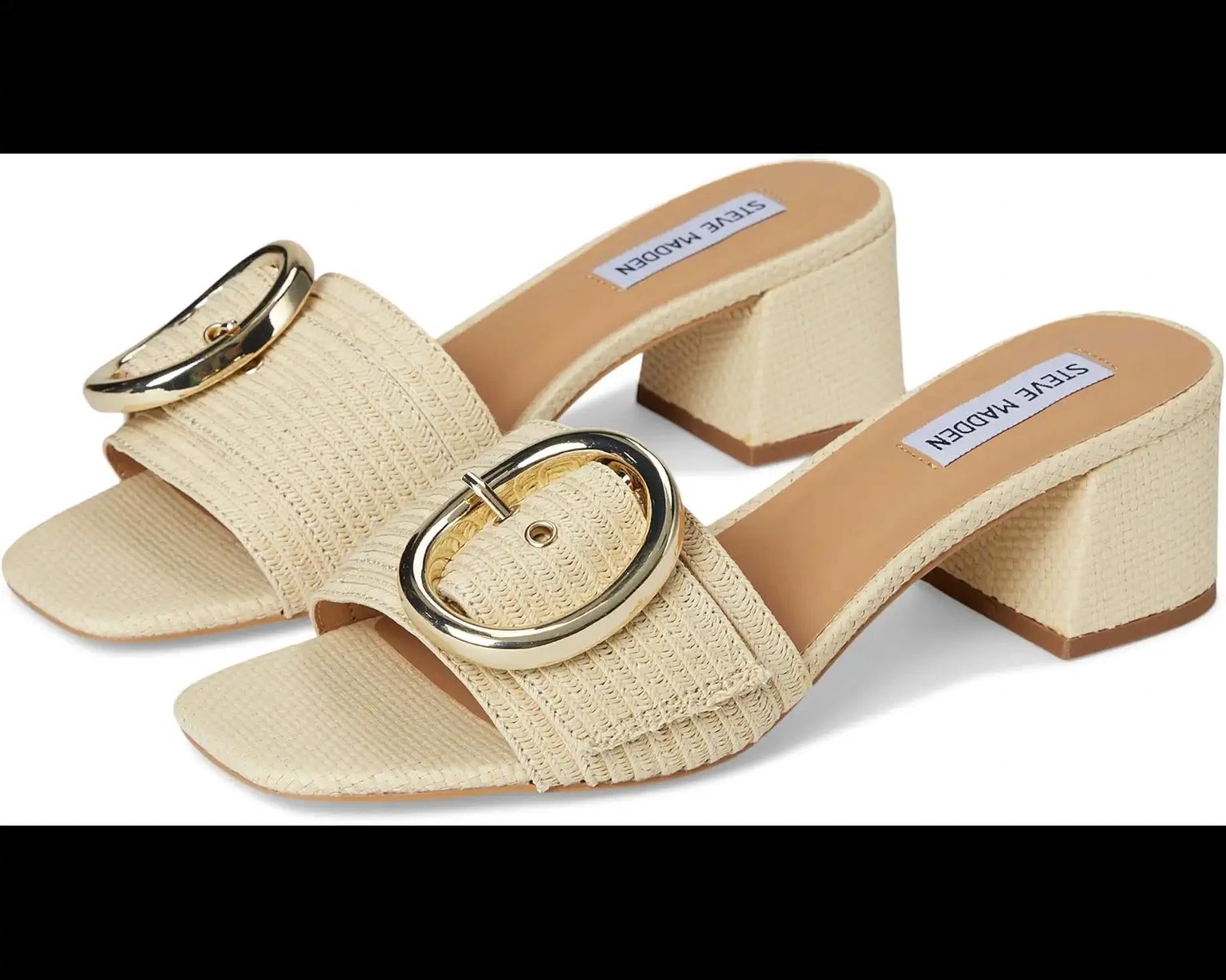 Flowy dresses, cropped pants, and even jumpsuits... this sandal works with them all! Step into sophistication with the Women's Seacrest Sandal by Steve Madden, a staple in minimalist summer fashion. This natural raffia mule heel brings elegance with an open square-toe design complemented by a chic buckle ornament detail. Made with a synthetic raffia upper, lining, sock, and sole, it stands out with its 2-inch block heel, perfectly balancing style and comfort. Imported to guarantee quality, this sandal is ideal for any occasion, from Thanksgiving dinners to elegant outings.