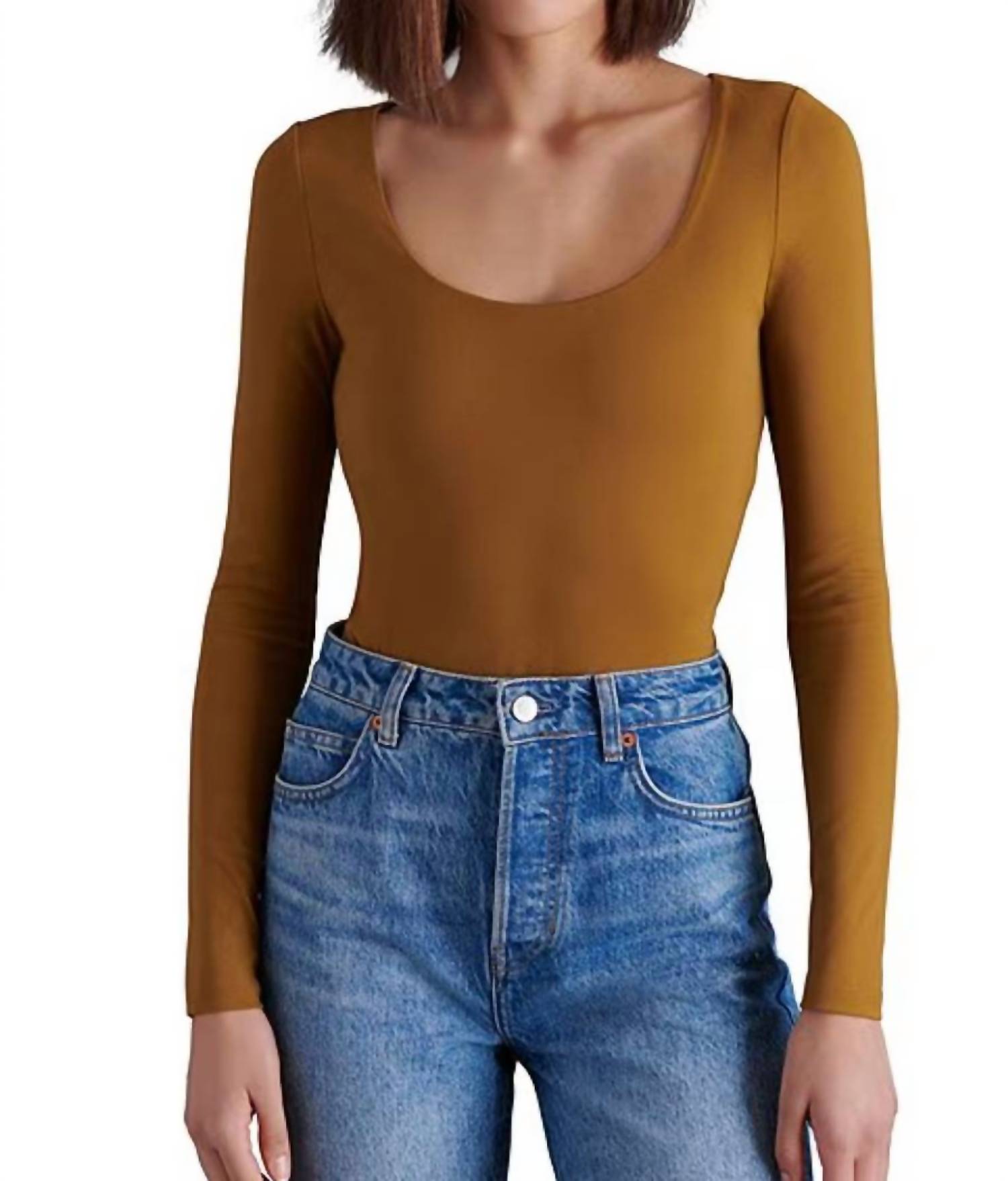 Introducing the Yura Bodysuit by STEVE MADDEN, a versatile must-have for any wardrobe in sophisticated Chestnut. This long sleeve piece, crafted from a stretchy 82% Nylon 18% Elastane Blend, features a feminine scoop neck and a 27.5" garment length, perfect for achieving a polished look. Designed with a pull-on closure for ease, this solid-patterned bodysuit promises effortless style day or night. Care instructions recommend hand washing to maintain its minimalist elegance.