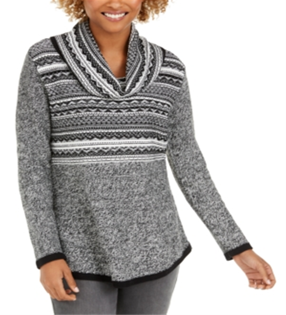 A Style & Co garante um look aconchegante e estiloso com este suéter pequeno. Sua gola alta espaçosa ajuda a combater o frio de forma moderna. | Projetado para se ajustar e valorizar pessoas de 1,62 m ou menos | Gola alta | Listrado na parte superior; mesclado na parte inferior e nas mangas | Algodão/acrílico | Lavável à máquina