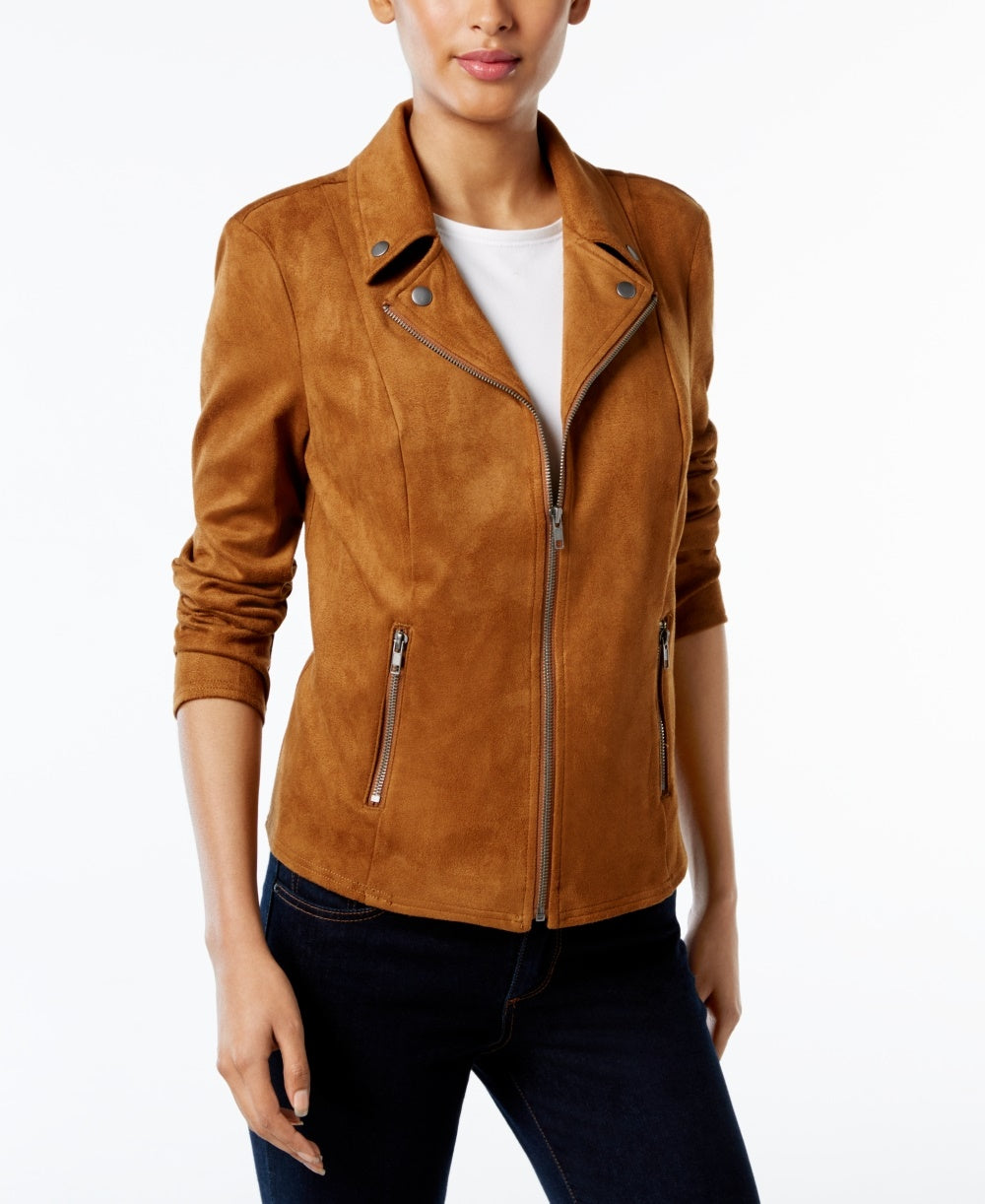 Jaqueta de motociclista feminina Style & Co de camurça sintética marrom, tamanho pequeno e pequeno