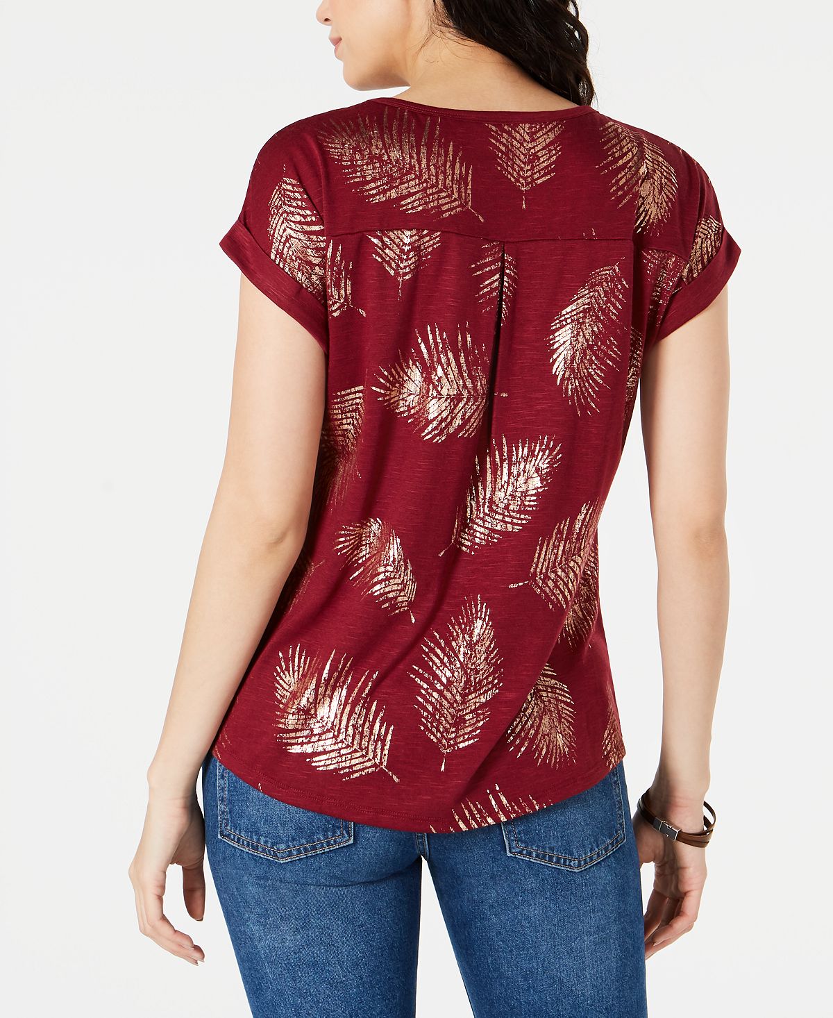 Uma estampa de folhas brilhantes acrescenta interesse e intriga a este top com decote redondo da Style & Co. | finalizado com mangas dolman com punho e uma prega invertida nas costas. | Caimento relaxado; atinge o quadril; aprox. 28 de comprimento | Devido ao tamanho generoso | sugerimos um tamanho menor para um ajuste perfeito | Decote redondo