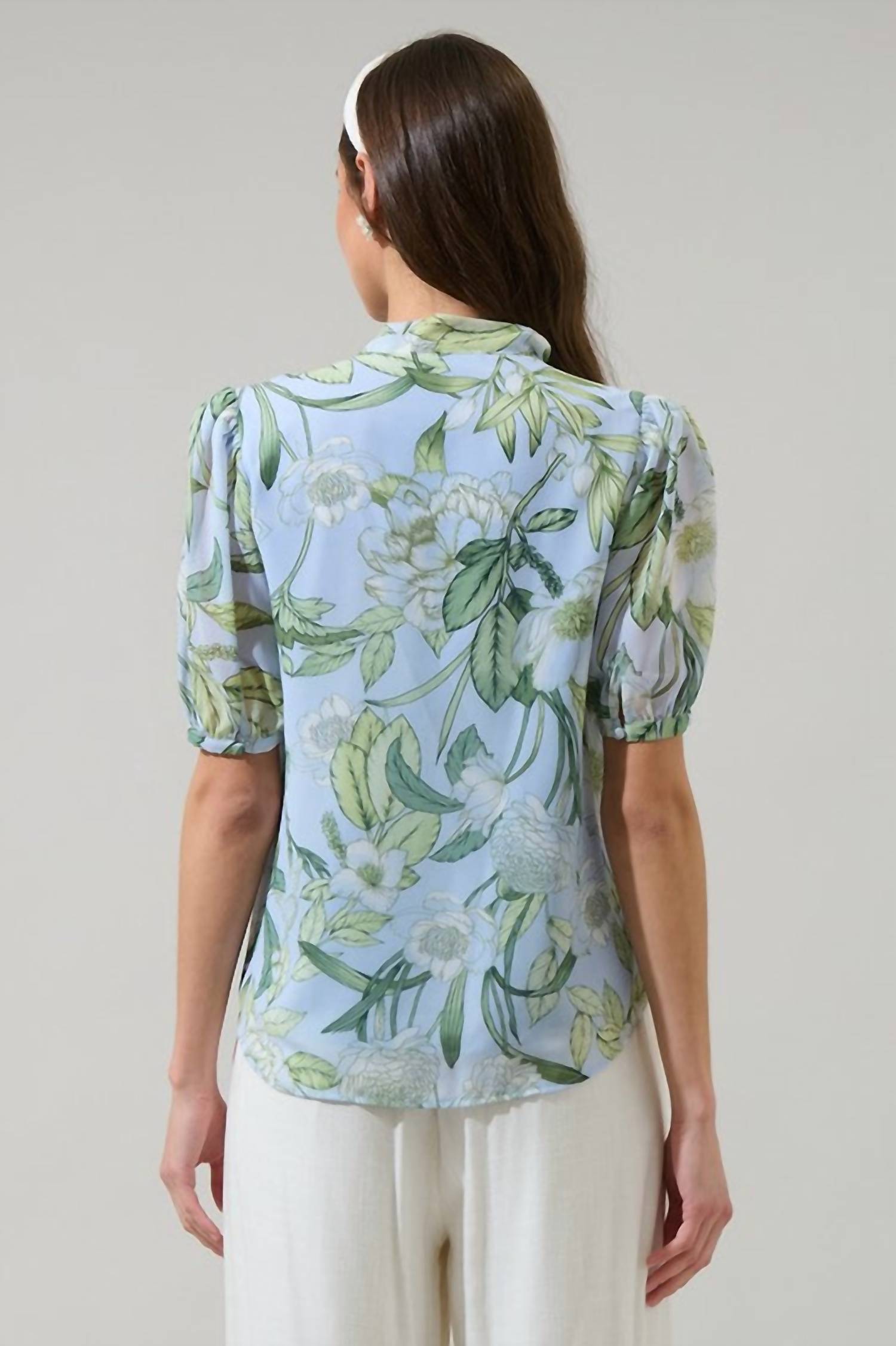 A timeless blouse that will never go out of style. Introducing the Sara Bloom Tie Neck Blouse by SUGARLIPS, an embodiment of vintage-inspired elegance. This women's blouse features a mockneck design and elbow-length sleeves, beautifully rendered in a white-green floral pattern. Crafted from 100% polyester, it offers a comfortable pull-on closure and is perfect for spring vacations or Thanksgiving gatherings. To maintain its sophisticated style, hand wash and line dry this piece, experiencing luxury in everyday wear.