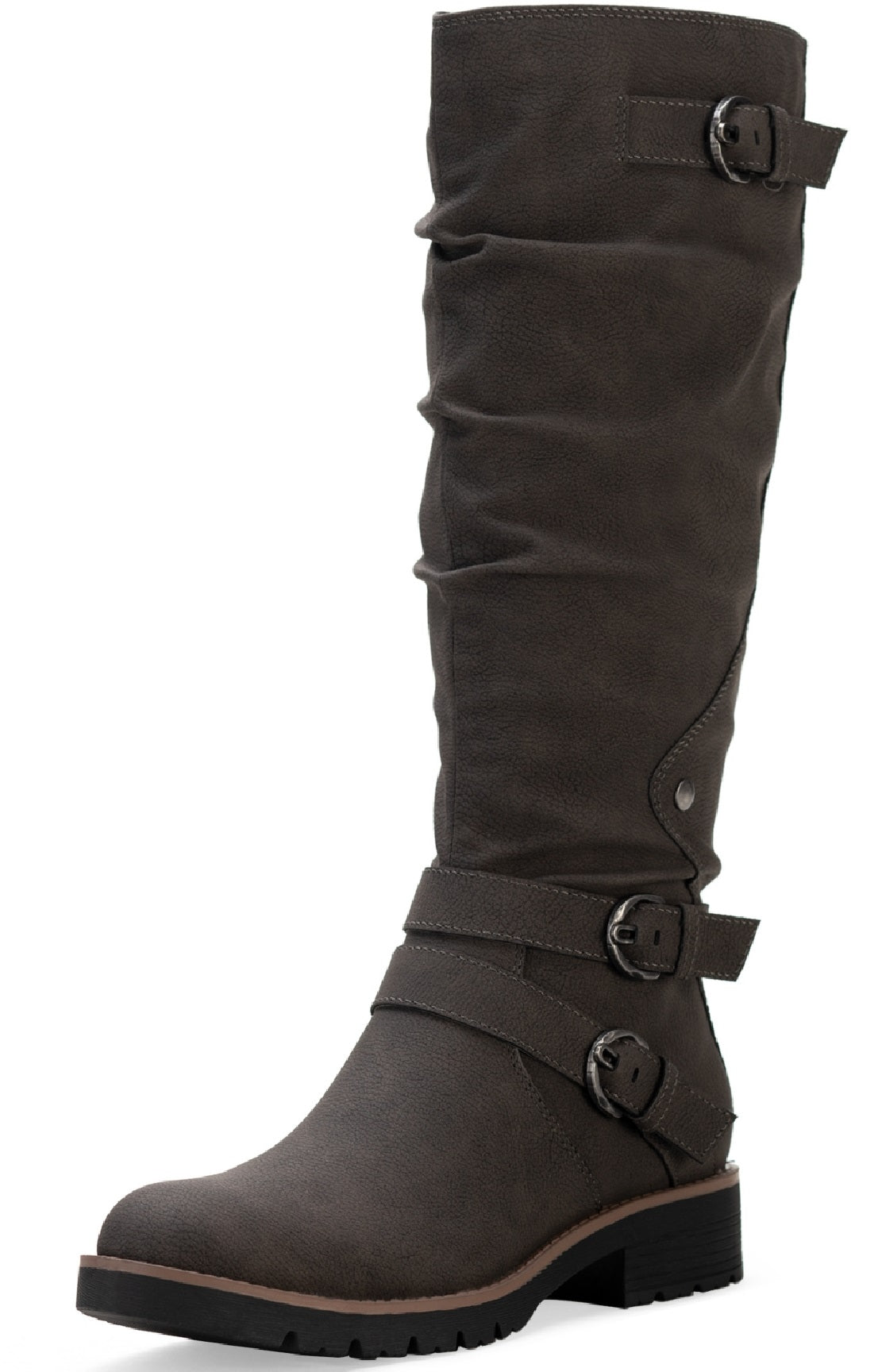 Salto bloco 1-3/8 | Altura do cano; 14-1/4; Circunferência; 15-1/2; medido no tamanho 6 | Botas de bico redondo com fecho de zíper lateral | Tiras com fivela e acabamento em tachas no cano; silhueta folgada; contraste na bainha; sola de entalhe | Palmilha acolchoada; espuma de memória para conforto; forro respirável; sola flexível e antiderrapante | NOTA: A altura do cano e a circunferência variam de acordo com o tamanho