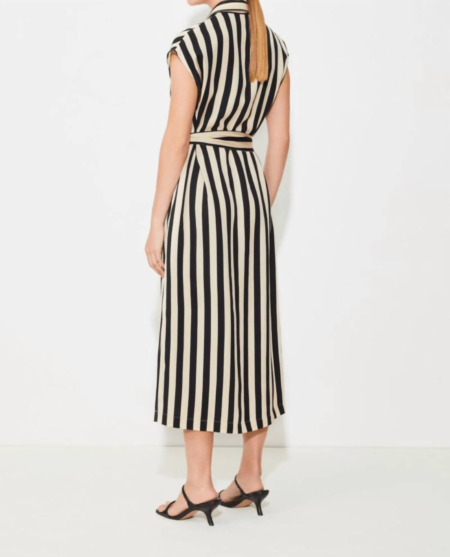 Basta adicionar slides ou mules e pronto. Apresentamos o Vestido Midi Celest da Suncoo, uma peça essencial e chique para o vestuário profissional moderno. Este vestido-camisa listrado preto apresenta mangas curtas e uma gola clássica com fecho frontal por botões. Confeccionado em uma mistura de viscose sustentável FSC, inclui um cinto removível tom sobre tom para amarrar e duas fendas laterais na parte inferior para maior movimento e estilo. As instruções de cuidado recomendam lavagem à mão para manter seu design elegante.