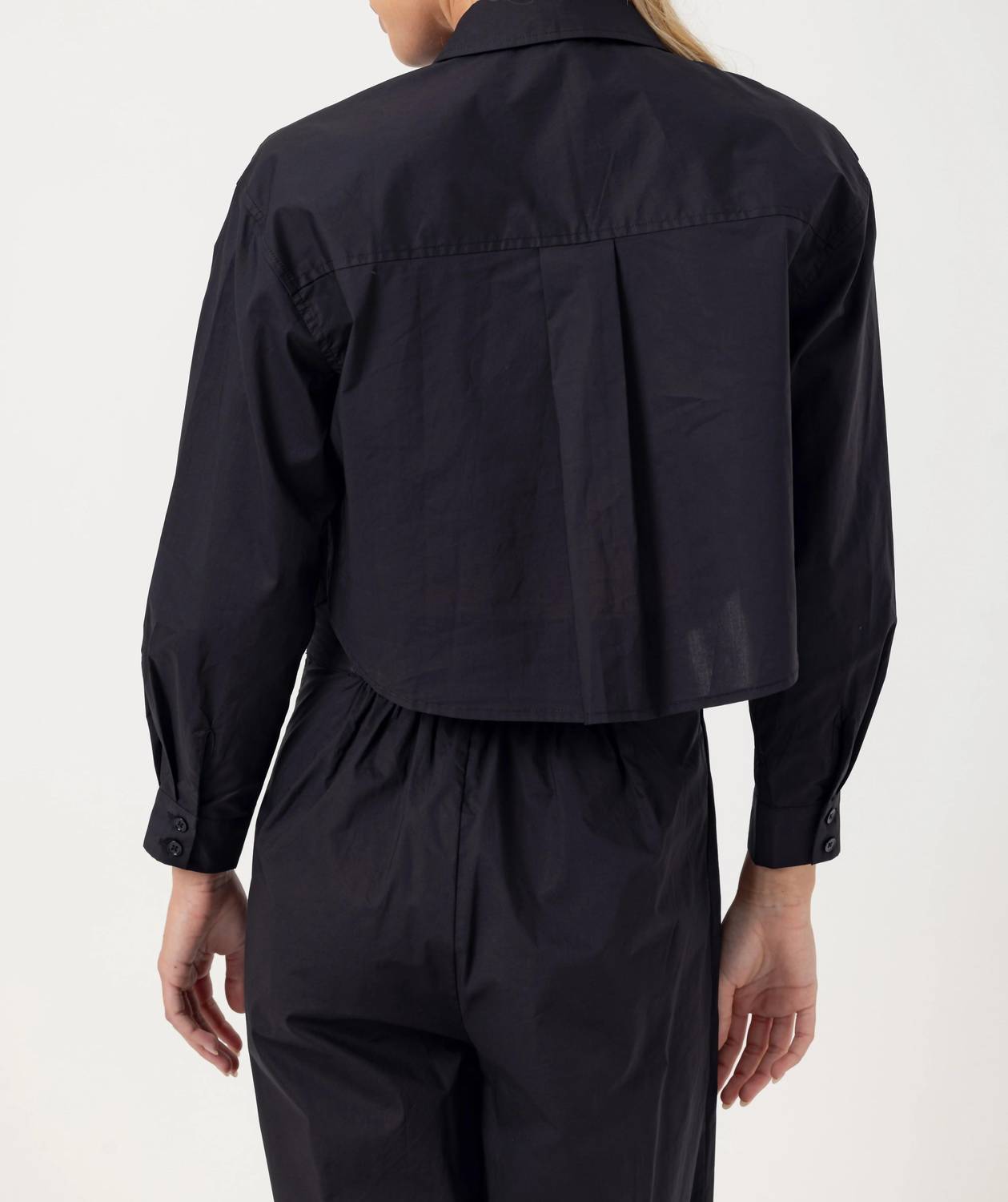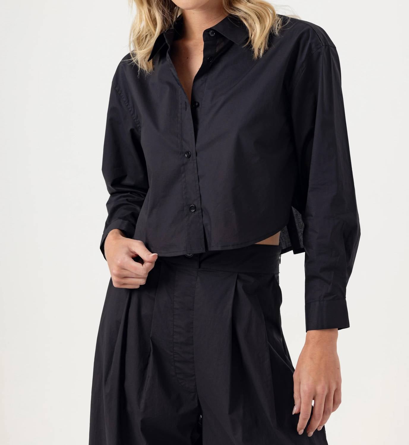 Perfectly tailored and soft to the touch. Discover the Charlie Shirt by Sundays, a chic addition to any spring wardrobe. Designed in crisp white cotton poplin, this button-down features long sleeves and a classic shirt collar, accentuated by an elevated pleat back detail for a touch of sophistication. The shirt's slightly boxy fit and cropped length, which rests just below the belly button, make it an ideal match for high-waisted styles. Care instructions include machine washing cold with like colors and tumbling dry on low.