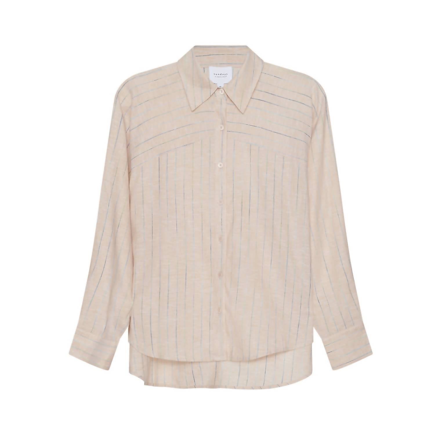 This button down shirt is comfortable yet polished. Introducing the Linen Adora Shirt by Sundays, a perfect blend of style and comfort for warm days. This breezy button-up features long sleeves, a classic collared neckline, and an exaggerated raglan sleeve for a relaxed fit. Crafted from a 50% Cotton, 50% Linen blend in a chic multi-stripe, it's ideal for creating a coastal getaway look. Closure: Button closure. Care: Machine wash cold, tumble dry low. Model is wearing a size XS (5’10” height, 32” bust, 25” waist, 35” hips).