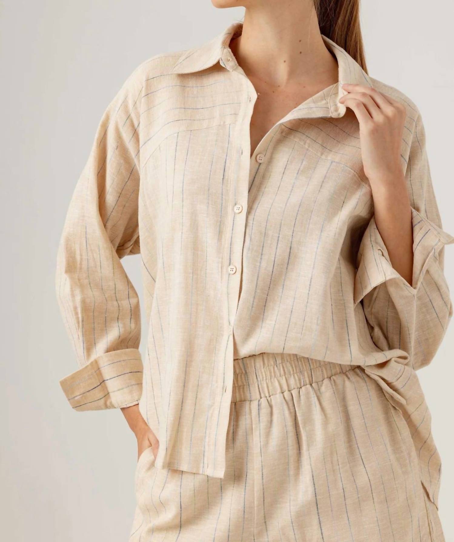 Perfectly tailored and soft to the touch. Experience the elegance of the Multi Linen Adora Shirt by Sundays, tailored for a refined silhouette. This women's button-down shirt in beige features long sleeves and is crafted from a premium linen blend, enhancing its durability and breathability. The striped pattern lends a dose of minimalistic charm, making it suitable for both professional and holiday party settings with a button closure for convenience. Ideal for the sophisticated woman looking to add a versatile piece to her spring wardrobe.