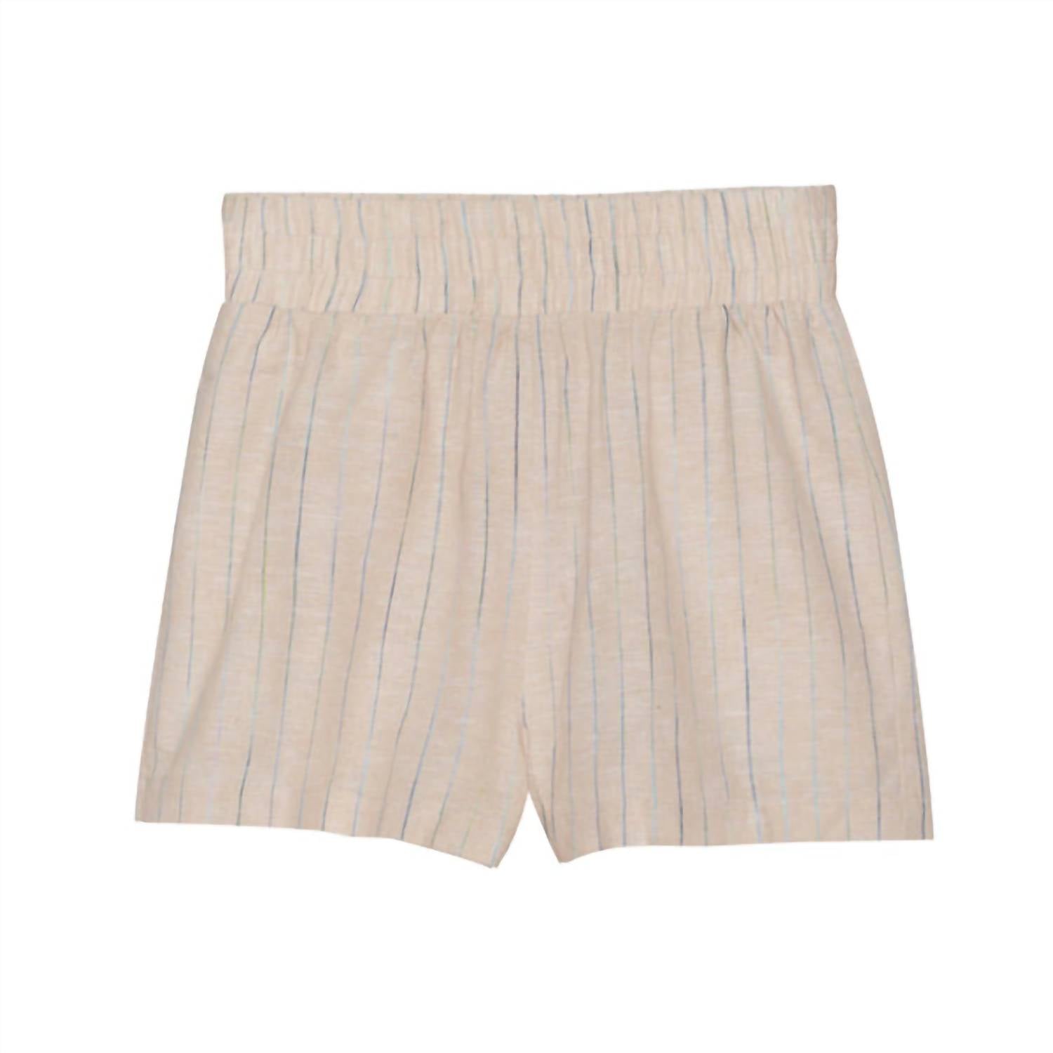 Tuck your favorite tee into these high-waist shorts for a more casual-cool feel. Introducing the Multi Stripe Linen Fuller Shorts by Sundays, perfect for summer gatherings and holiday parties alike. These high-waisted shorts boast a minimalist, multi-stripe pattern in beige, tailored from breathable linen for optimal comfort. Featuring a pull-on closure, they offer ease and a flattering fit without the bulk of pockets. Embrace this versatile piece designed for sophisticated style and effortless movement.
