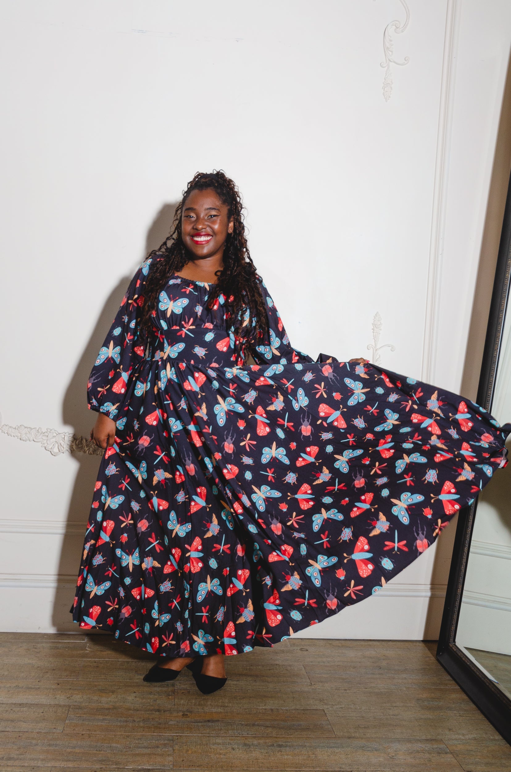 Swann 70s Maxi Dress in Insect Print Crepe | Laura Byrnes & Hope Johnstun