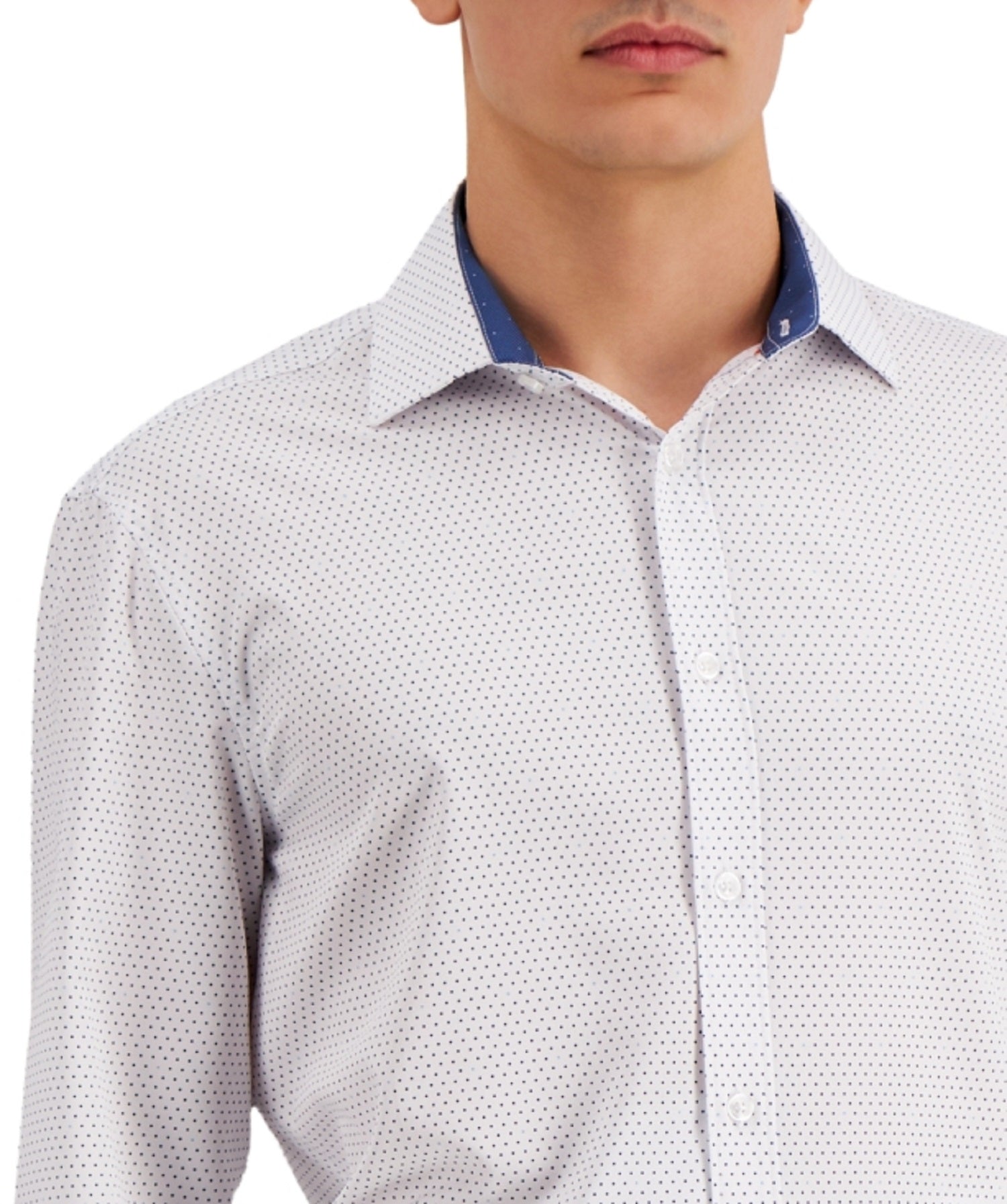 Adicione um estilo contemporâneo distinto aos seus itens essenciais sofisticados com a alfaiataria simplificada e os punhos contrastantes desta camisa social elástica com estampa de bolinhas da Tallia. | Estampa de bolinhas | Gola e punhos internos contrastantes | Gola aberta | Leve | Tecido absorvente de umidade que ajuda a evaporar a umidade | Importado