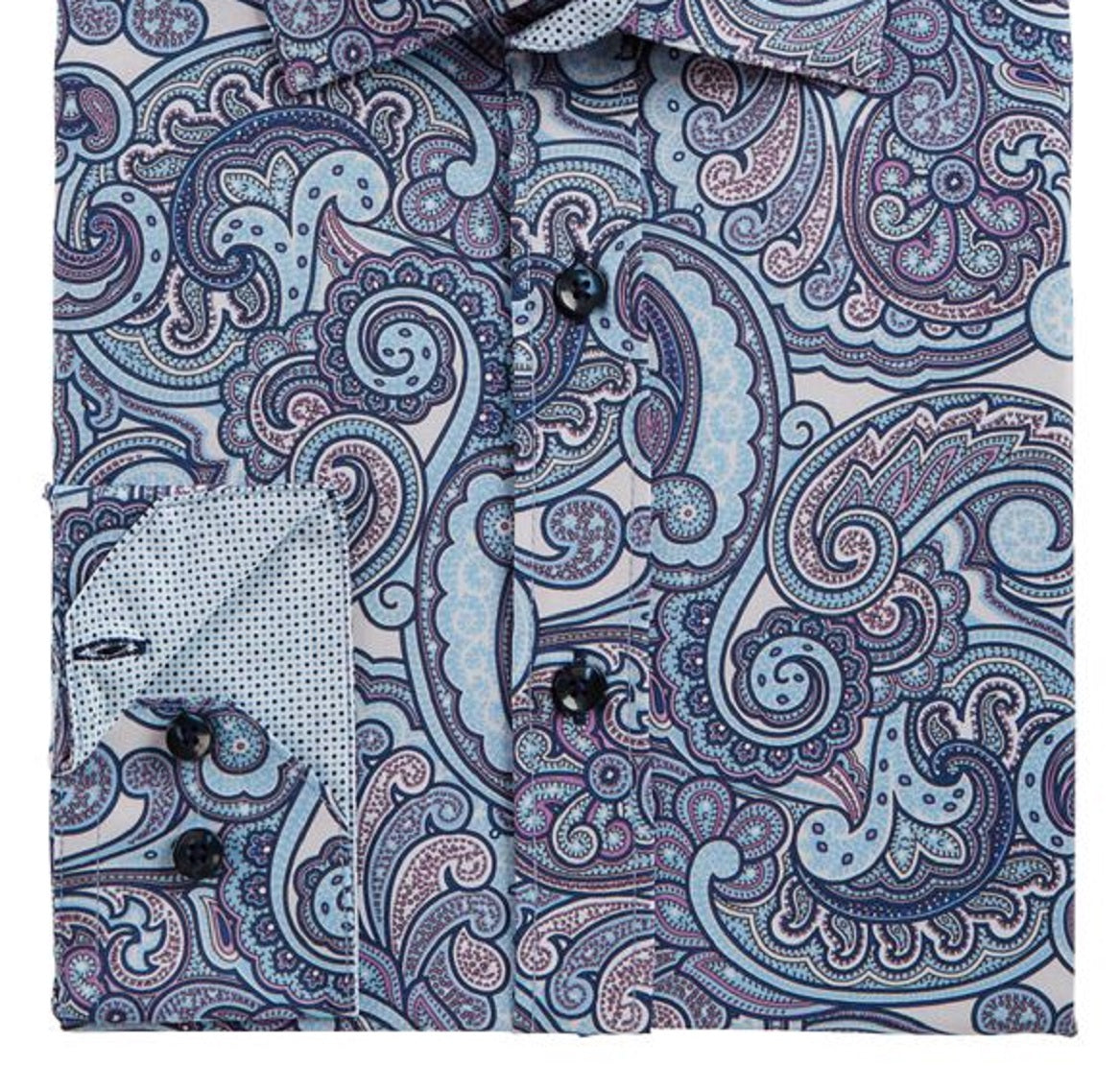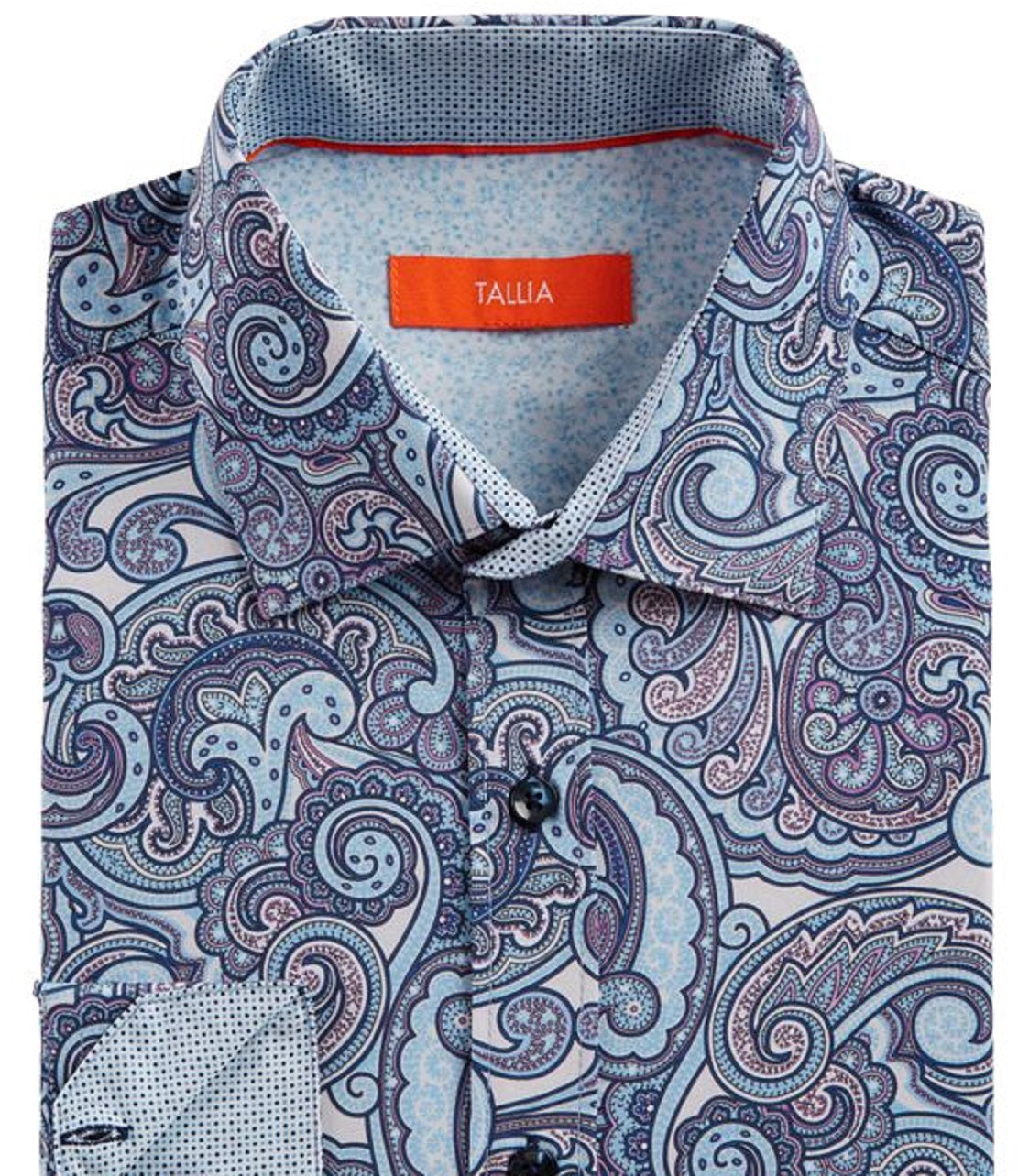 O paisley hipnótico em tons frios faz desta camisa social slim fit da Tallia uma adição de destaque à sua coleção | completa com tecido antirrugas | que absorve a umidade para manter você fresco e composto a noite toda. | O corte slim é cortado mais rente ao peito | mangas e cintura; apresenta cavas e mangas finas | Gola aberta | Punhos com botões