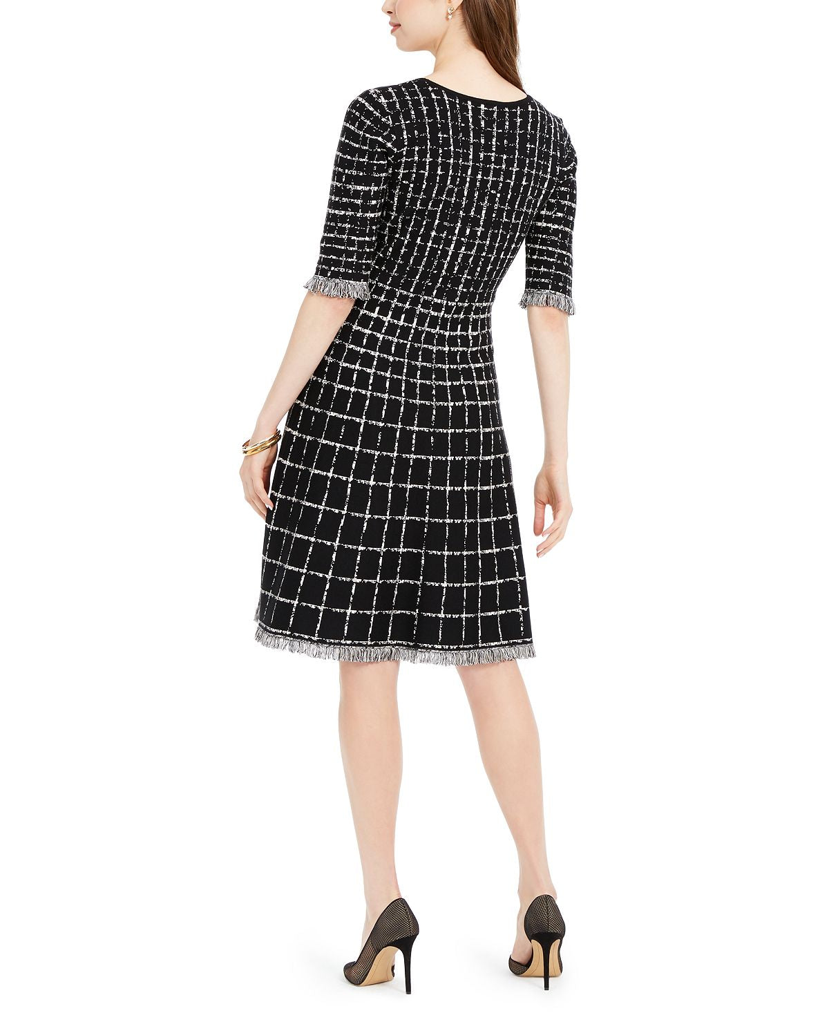 Elegante de ponta a ponta | Este vestido suéter xadrez da Taylor apresenta franjas nos punhos e na bainha para um toque de charme. | Comprimento aproximado de 38, do centro do pescoço até a bainha. O comprimento é baseado no tamanho P e varia de 1/2 entre os tamanhos. | Gola redonda | Modelagem pull-on | Mangas 3/4