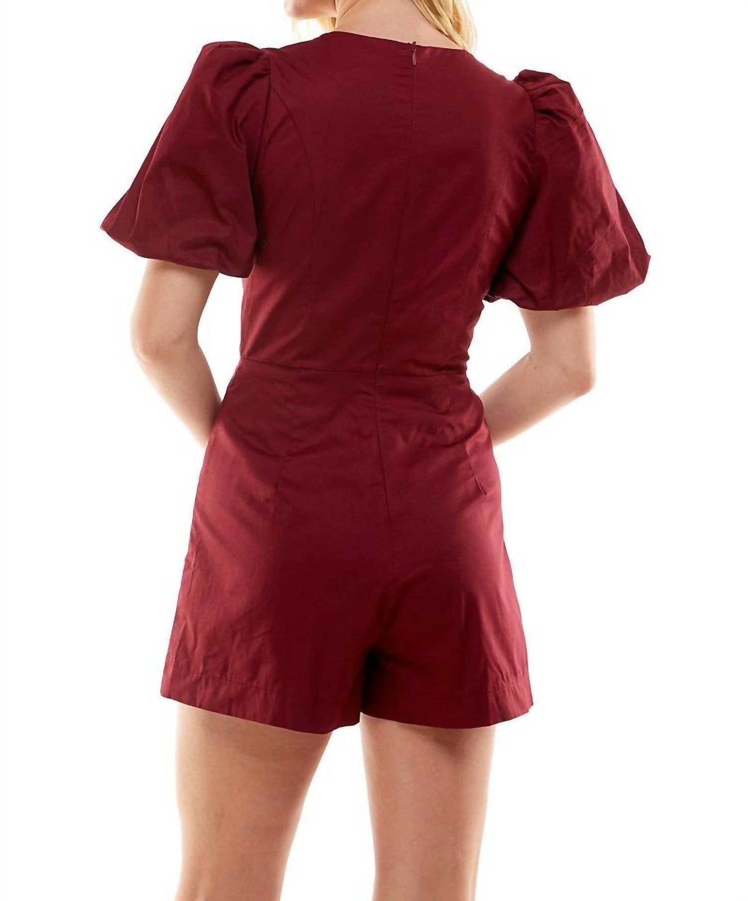 Introducing the Grace V-neckline Romper by TCEC in elegant maroon, a perfect choice for Game Day or any stylish occasion. This romper features short puff sleeves crafted from durable poplin fabric and a flattering V-neckline. Closure: Hidden zipper back. Care: Hand wash and lay flat to dry.