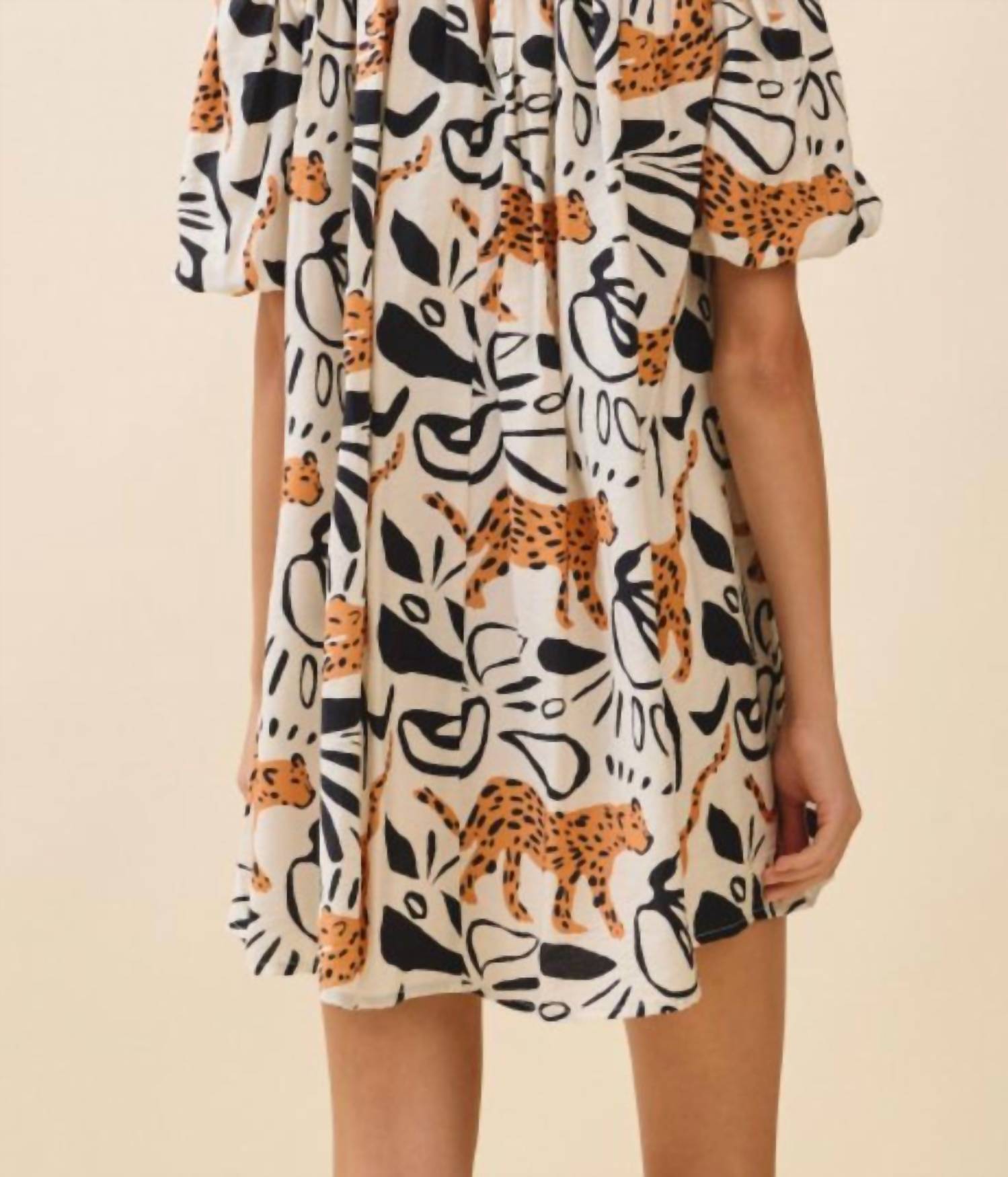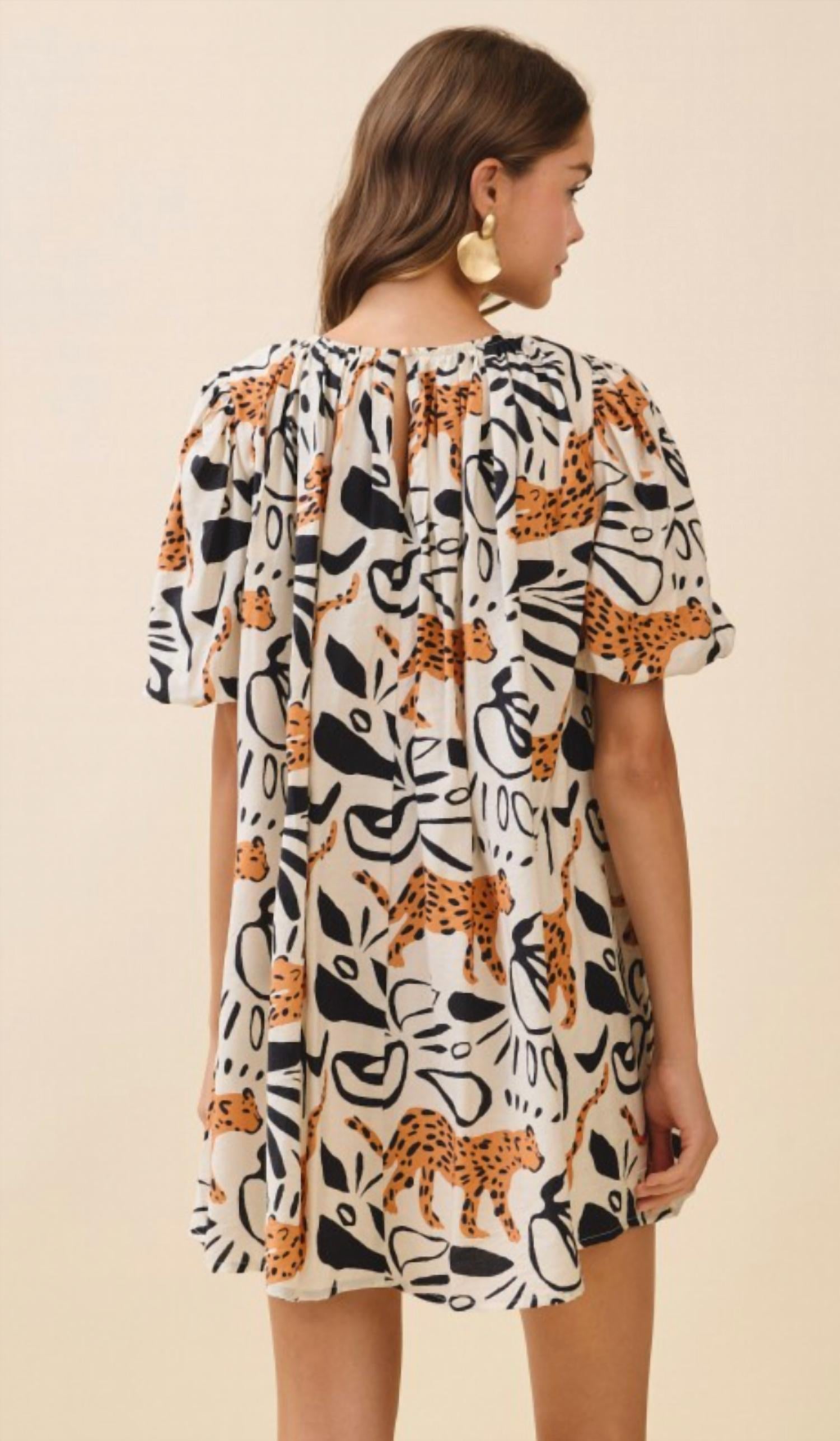 Step into playful vibes with the Puff Sleeve Swing Dress by TCEC, showcasing a bold leopard print in cream. This women's mini dress features short sleeves and a classic crewneck for a shift silhouette that's perfect for vacation or Easter occasions. Closure: Button closure. Care: Hand wash and line dry for best results.