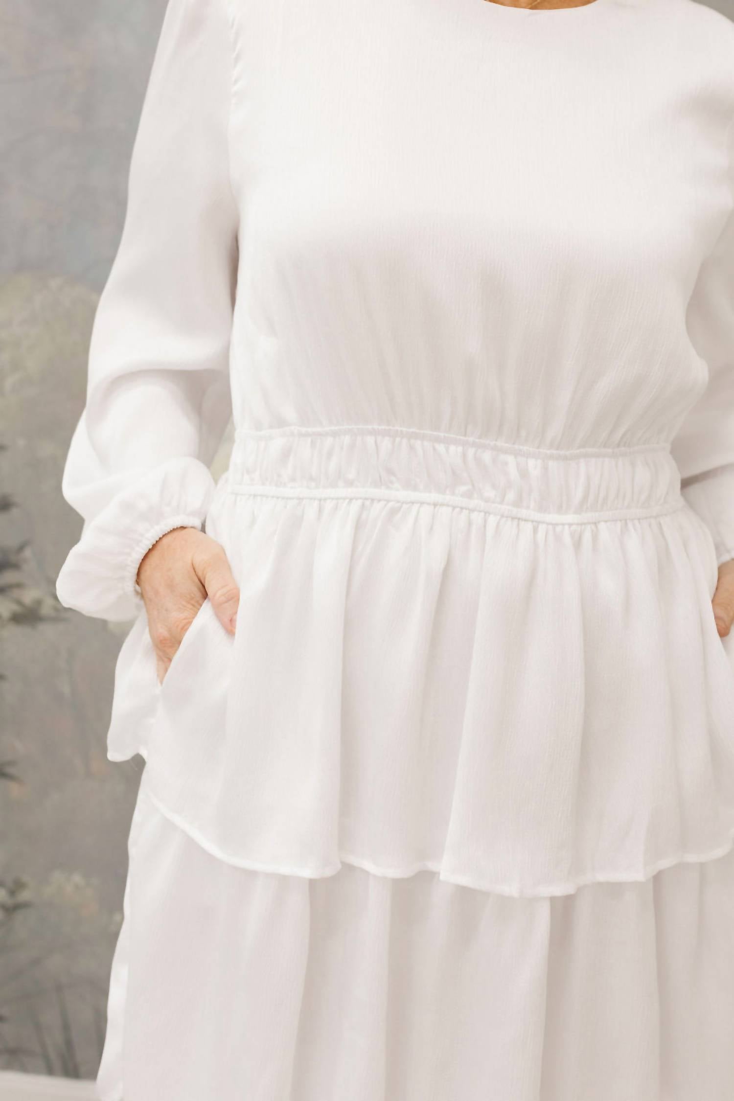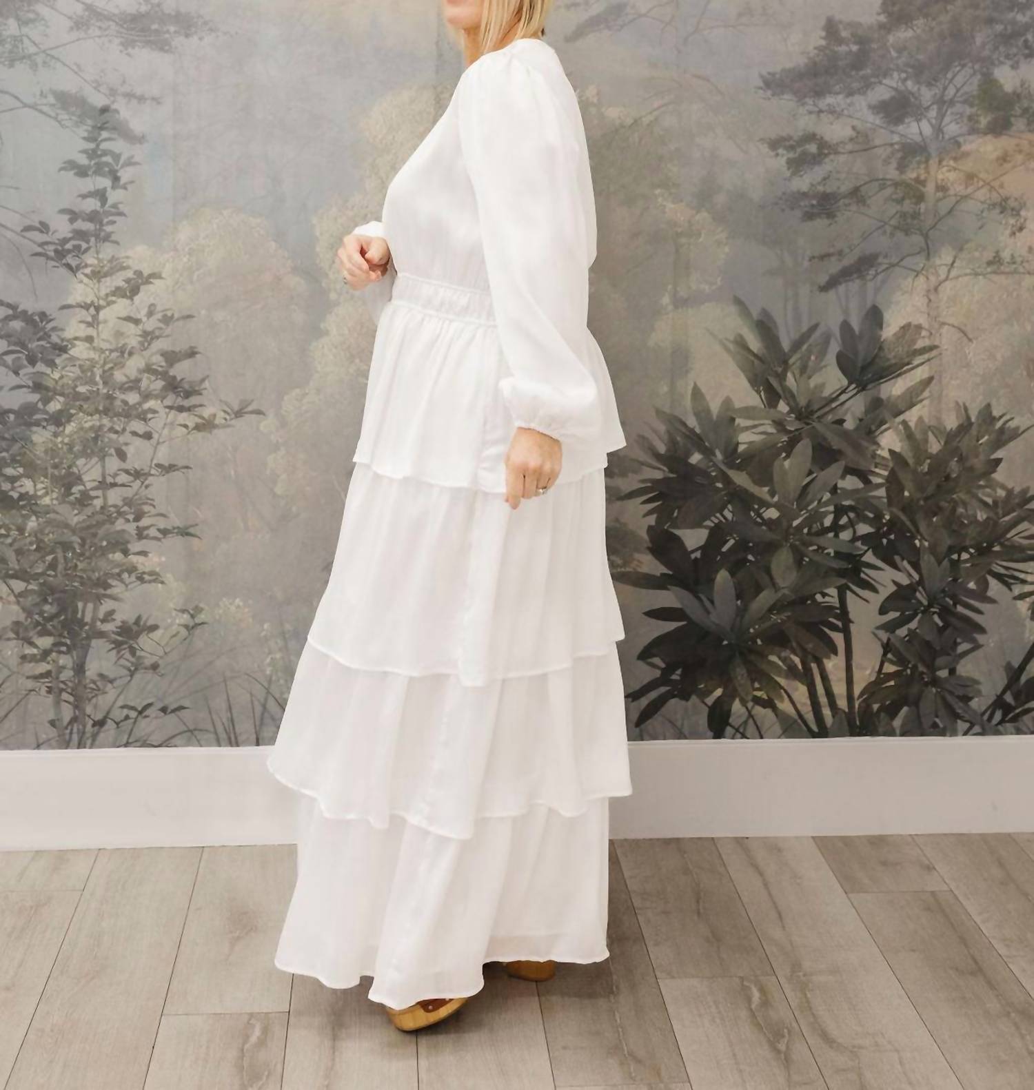 Discover the elegant Tiered Maxi Dress by Tea N Rose, a sophisticated addition to your wardrobe. Made from 99% polyester and 1% spandex, this dress features long puff sleeves and a flattering 55" A-line silhouette. Its solid white design is complemented by a crewneck and a subtle button closure at the back, offering a minimalist and chic look for any Spring occasion. Care is simple with hand washing, laying flat to dry, and the option for low iron if needed.