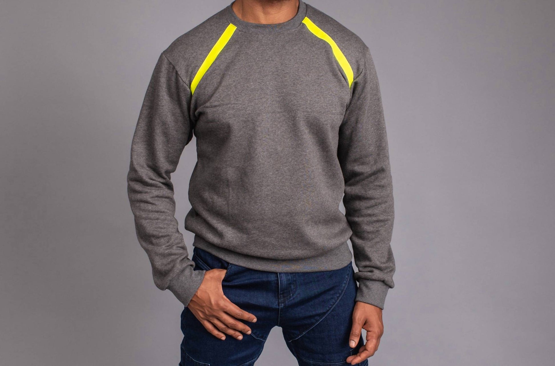 Introducing the Henry's Sweat Shirt by The Athletic Side Of Us, designed for both style and safety. This gray, long sleeve sweatshirt is crafted from 100% organic fleece cotton and features lemon green reflector accents for enhanced visibility in low-light conditions. Closure: Pull on. Ideal for hiking and perfect for the streetwear trend this spring.