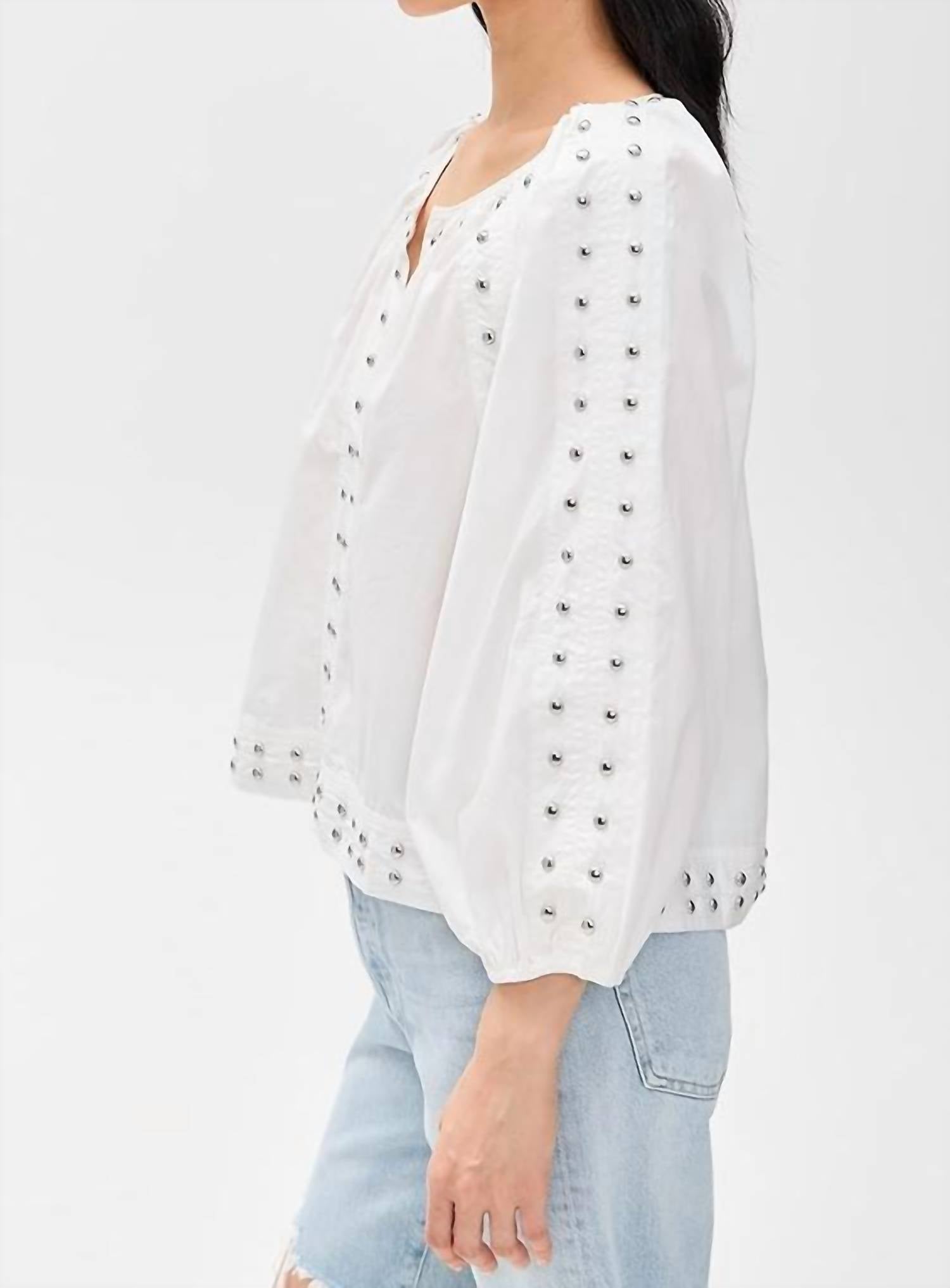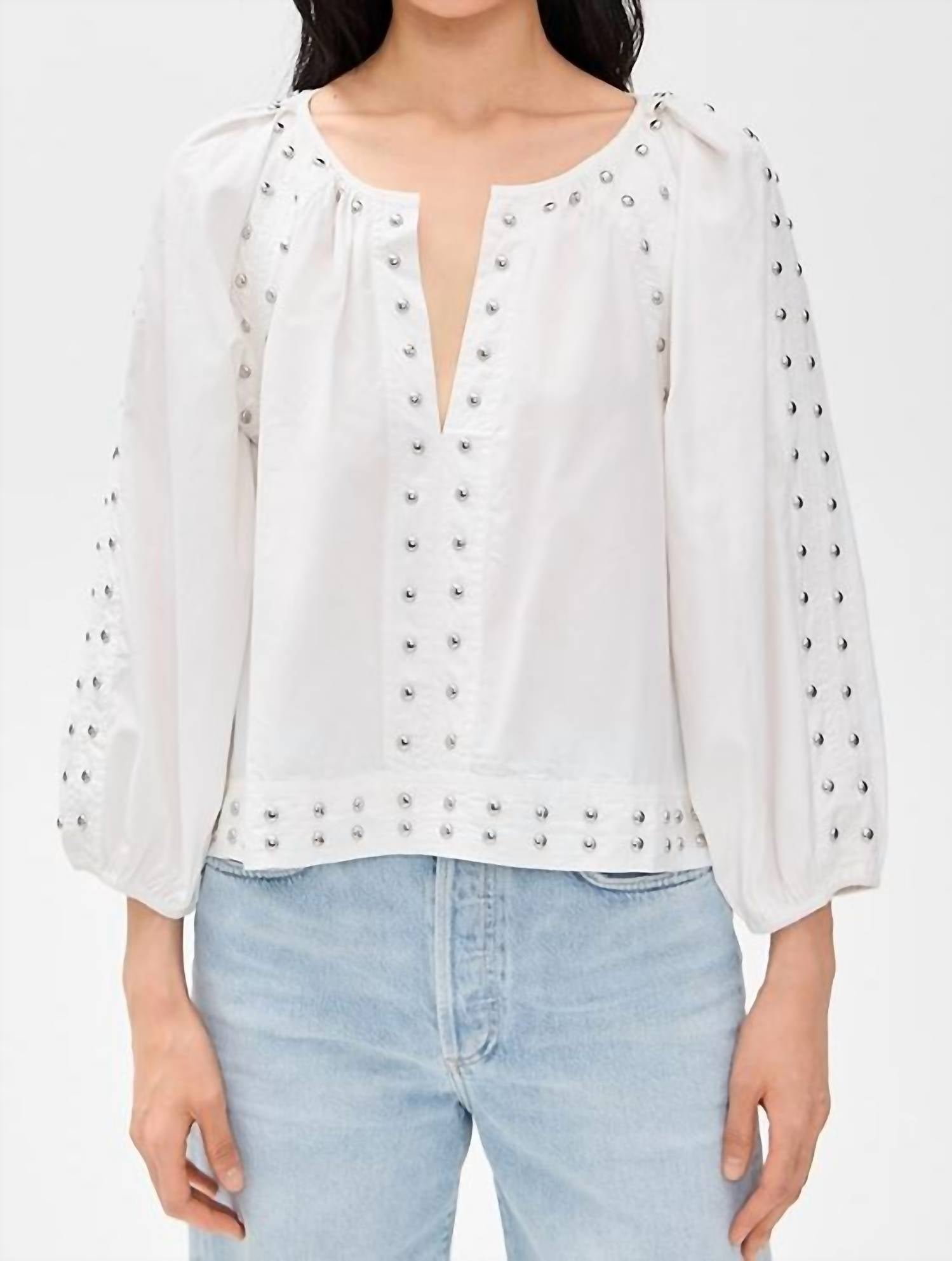 Combine isso com seus jeans e chinelos favoritos para sua próxima noite entre amigas. O Top Bodega com Tachas da THE GREAT é confeccionado em 100% algodão, com popeline leve e que não estica, proporcionando conforto e respirabilidade. Apresenta impressionantes detalhes em tachas prateadas e um elegante decote em V, combinado com mangas longas bufantes para um toque dramático. Esta blusa branca é fácil de usar, com fecho pull-on, e é importada da Índia. As instruções de cuidado recomendam lavagem a seco para manter a peça impecável. A modelo tem 1,75 m e veste tamanho 38.