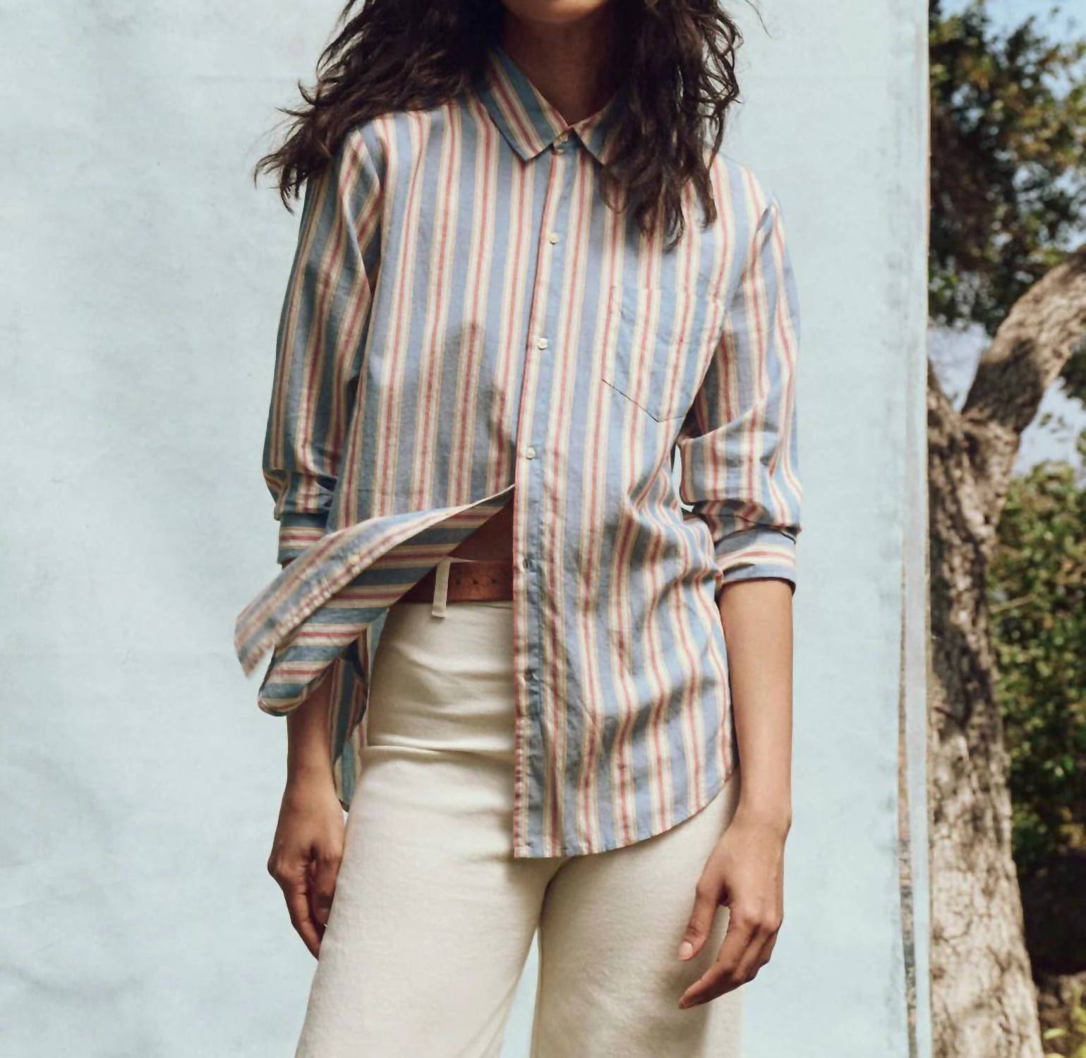 Uma camisa clássica de botões que nunca sai de moda. Apresentamos o Post Top da THE GREAT., uma peça sofisticada em listras azuis Frontier que esbanja charme sem esforço. Esta camisa feminina de botões apresenta mangas compridas e gola clássica, perfeitamente complementada por sua estampa listrada e bolso prático. Confeccionada em 100% algodão, esta camisa garante conforto respirável com fecho de botão para facilitar o uso. Para cuidados, basta lavar à máquina conforme necessário. A modelo tem 1,78 m e veste tamanho 38.