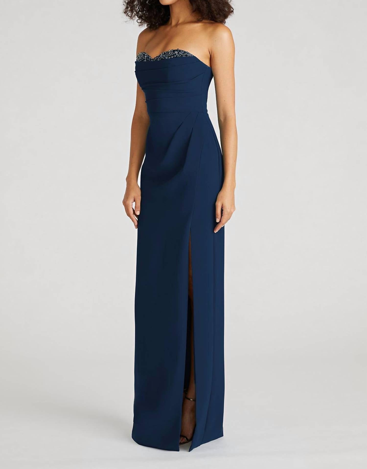 Style this maxi with your favorite statement necklace and sandals for the perfect look. Introducing the Women's Anastasia Strapless Gown by THEIA, a minimalist masterpiece perfect for evening events. This navy A-line maxi dress features a sophisticated sweetheart neckline and a sleek strapless design. Closure: Pull on. A chic addition to any summer wardrobe, this solid pattern gown epitomizes elegance.92% Polyester, 8% Polyurethane