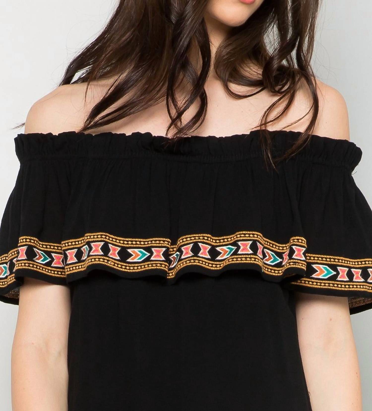 The Antigua Off The Shoulder Dress by THML is perfect for a stylish brunch outing. This solid black dress features a strapless, off-the-shoulder neckline with delicate embroidery, enhancing its chic design. The silhouette is a classic A-line mini, lined for comfort. Closure: Pull on. Sizes available include XS (Bust 32", Length 28"), Small (Bust 34", Length 28"), Medium (Bust 36", Length 28"), and Large (Bust 38", Length 28").