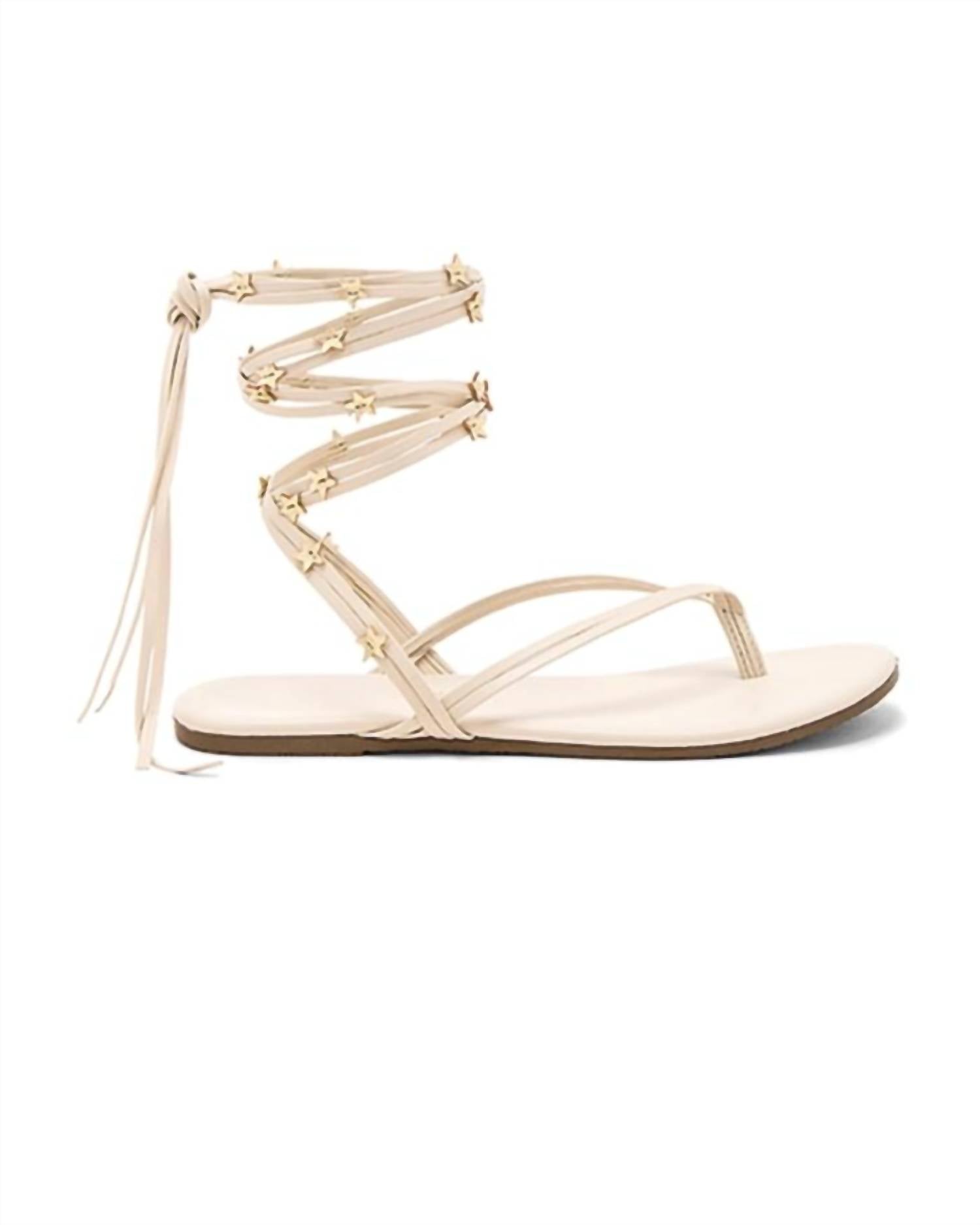 Vestidos fluidos, calças cropped e até macacões... esta sandália combina com todos! Sandália de couro com tornozelo cruzado, fecho de amarrar e apliques metálicos em formato de estrela. Tecido: Cabedal e palmilha de couro; Solado de borracha. Fabricado no Brasil.