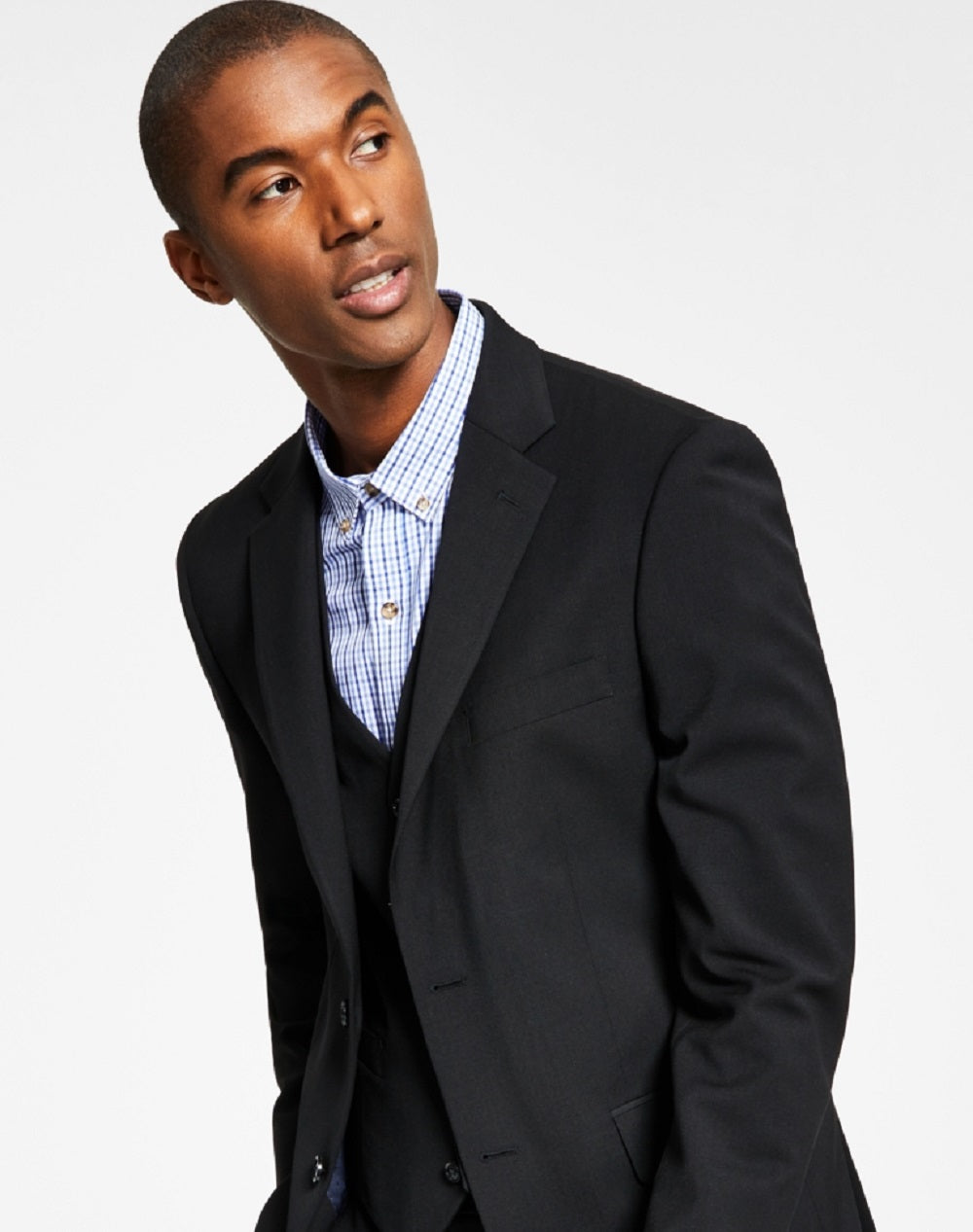 Dois bolsos frontais com aba | bolso embutido no peito esquerdo; bolsos embutidos internos | Colete e calças combinando vendidos separadamente | Lapela entalhada | Fecho de dois botões; punhos de quatro botões | Aberturas laterais; totalmente forrado; desempenho elástico | Importado