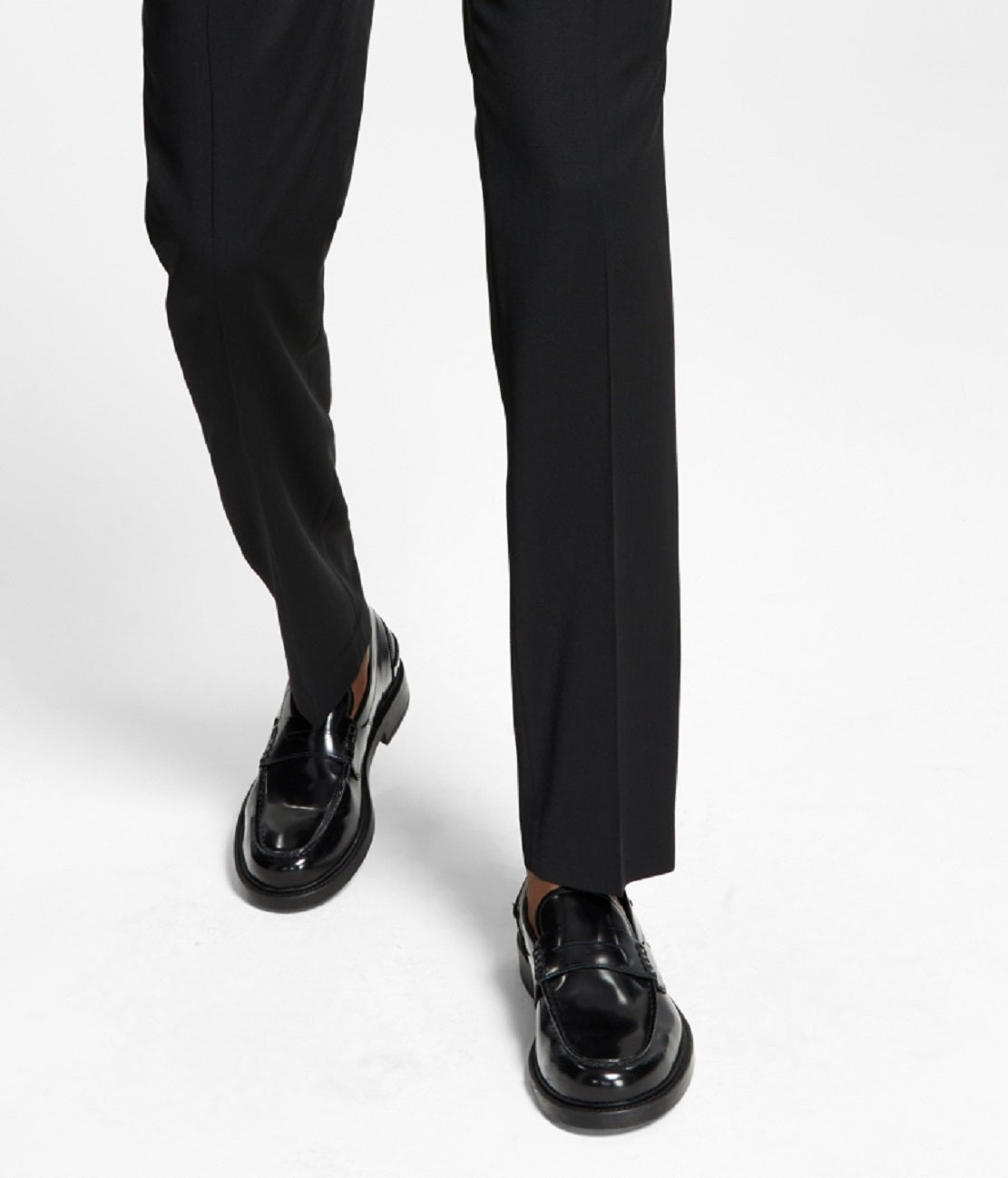 Colete e jaqueta combinando vendidos separadamente | Frente lisa; bainha acabada; sem punho | Vinco permanente | Importado | Braguilha com zíper e fechos de botão e colchete; passantes para cinto | Dois bolsos laterais inclinados; dois bolsos traseiros embutidos com botão