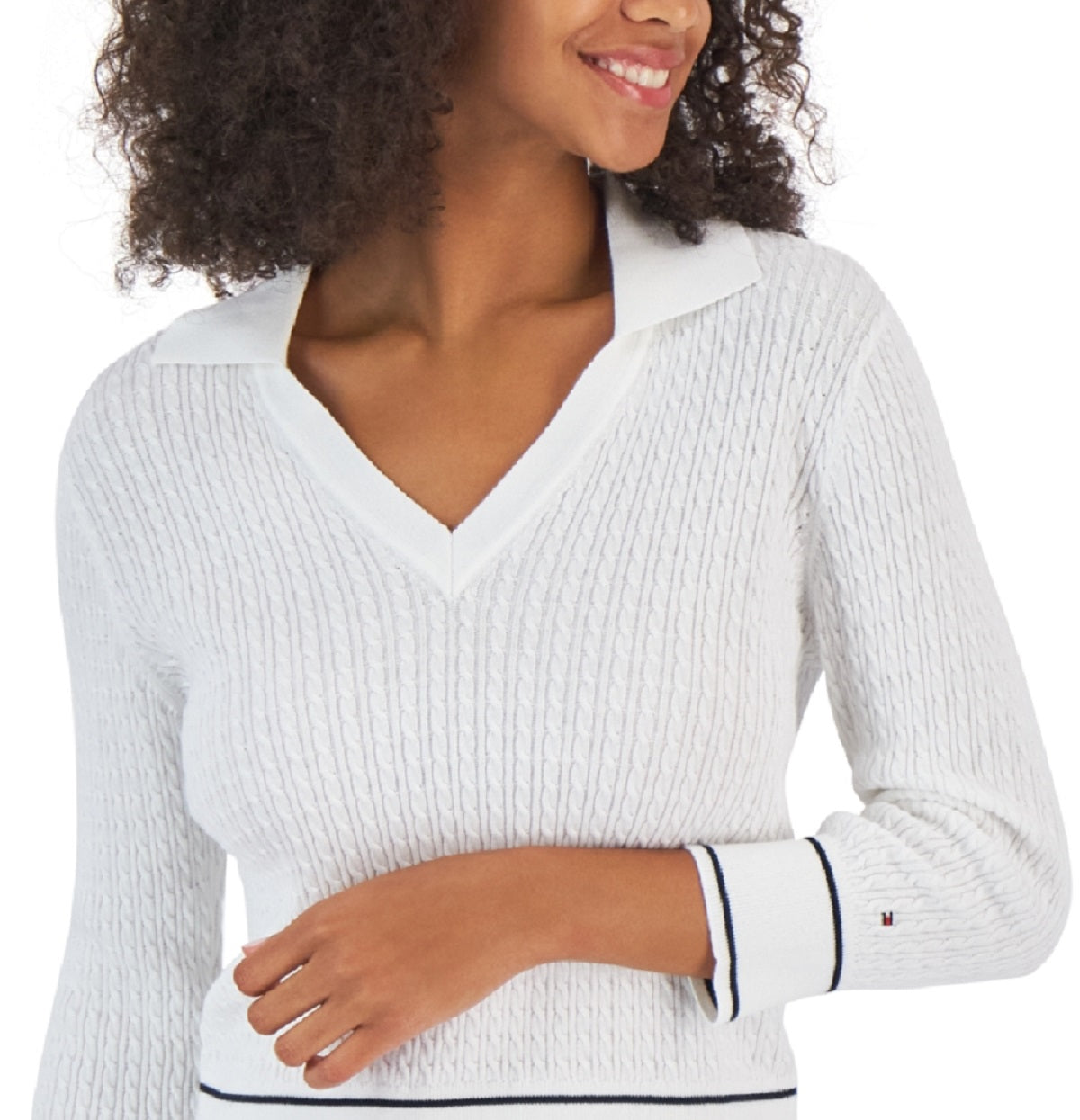 Tommy Hilfiger Suéter Feminino de Algodão com Gola Johnny em Tricô com Cabo, Branco, Tamanho X-G