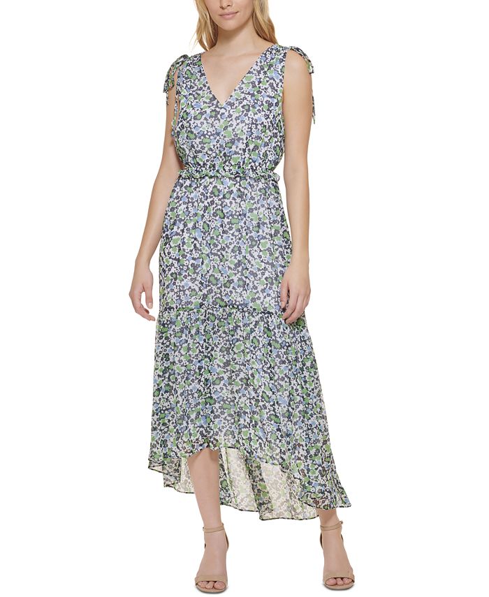 Uma explosão de flores acentua elegantemente o vestido midi Tommy Hilfiger | com bainha alta-baixa. | Aproximadamente 102 cm de comprimento, do centro do pescoço até a bainha. O comprimento é baseado no tamanho 4 e varia 1/4 entre os tamanhos. | Fiel ao tamanho; peça seu tamanho normal. | Cai abaixo do joelho até a panturrilha. | Chiffon; Suave.