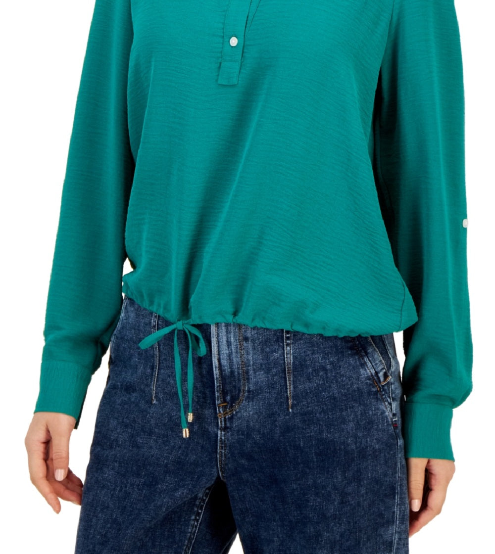 Cordão ajustável na cintura | Importado | Mangas com abas dobradas | Gola pontuda; fechos parciais de botões frontais