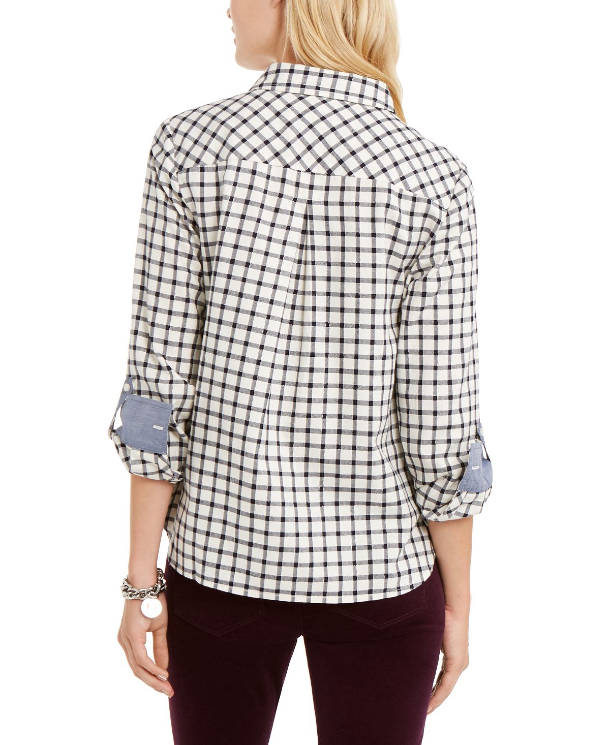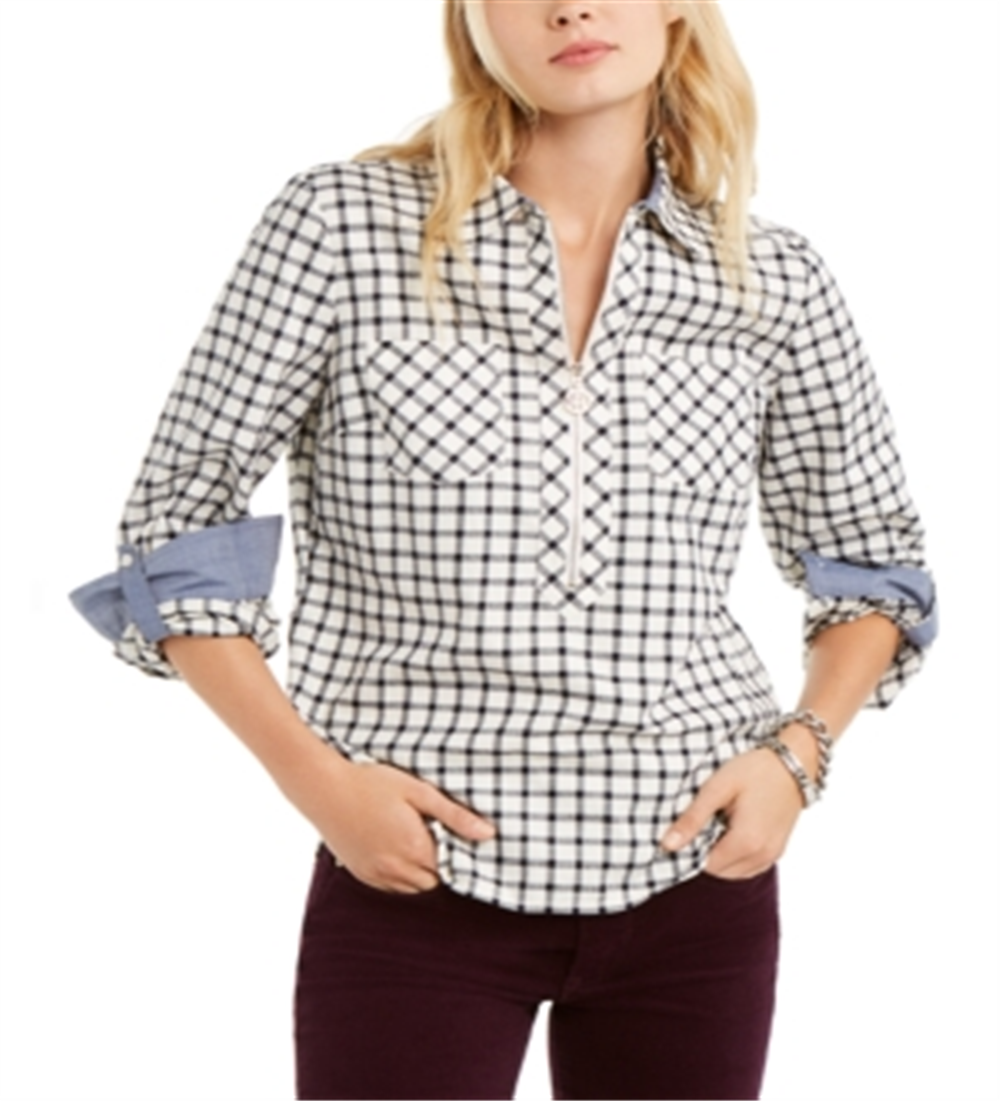 Tommy Hilfiger atualiza um visual que você sempre pode escolher com um decote contemporâneo com zíper nesta blusa de mangas dobradas. | Gola pontuda; zíper na parte superior frontal | Mangas compridas com abas dobradas | | Algodão/poliéster | Lavável à máquina ou a seco | Importado