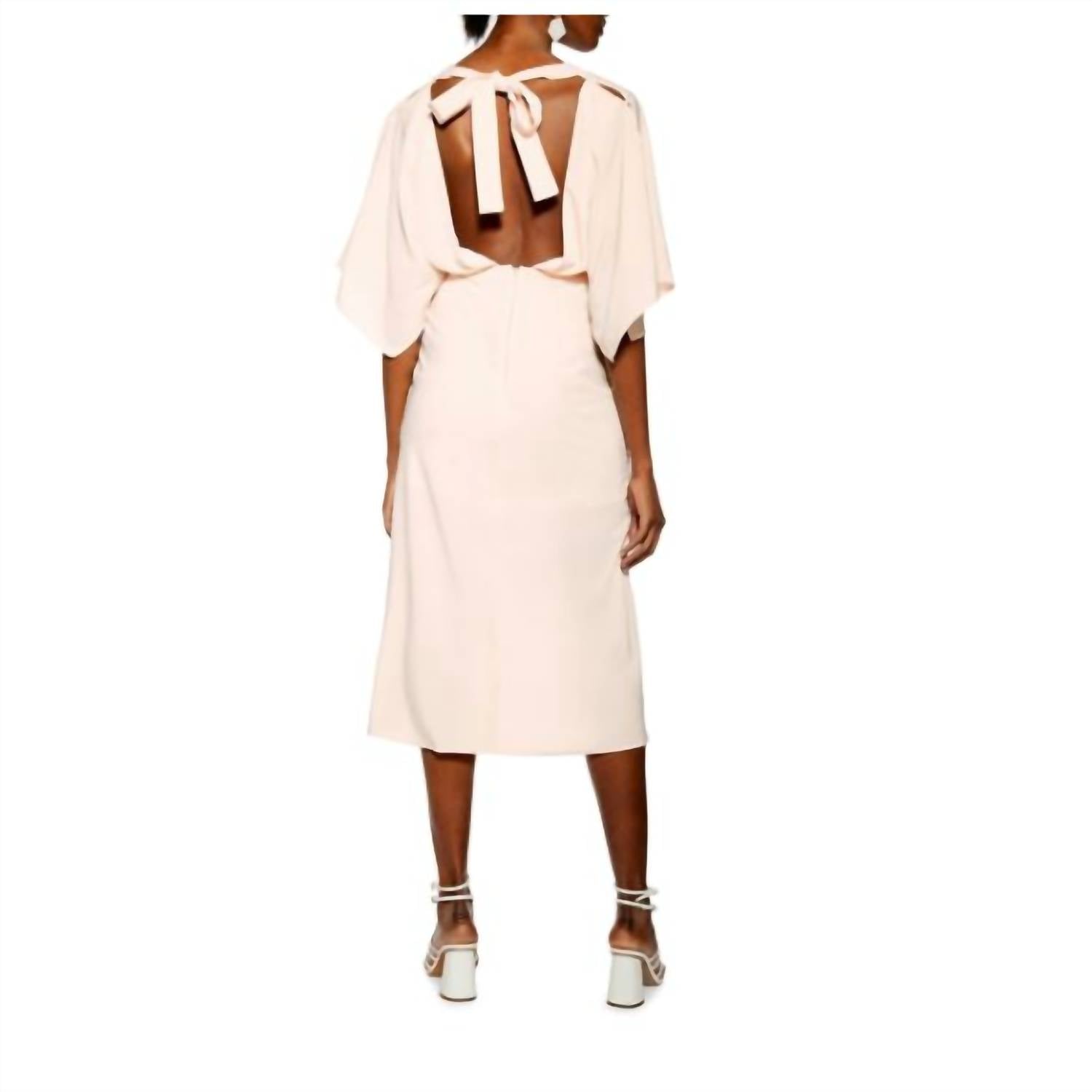 Prepare to blush in this flattering frock styled with drapey batwing sleeves, a low-dipping neckline and a prim bow-tie back.