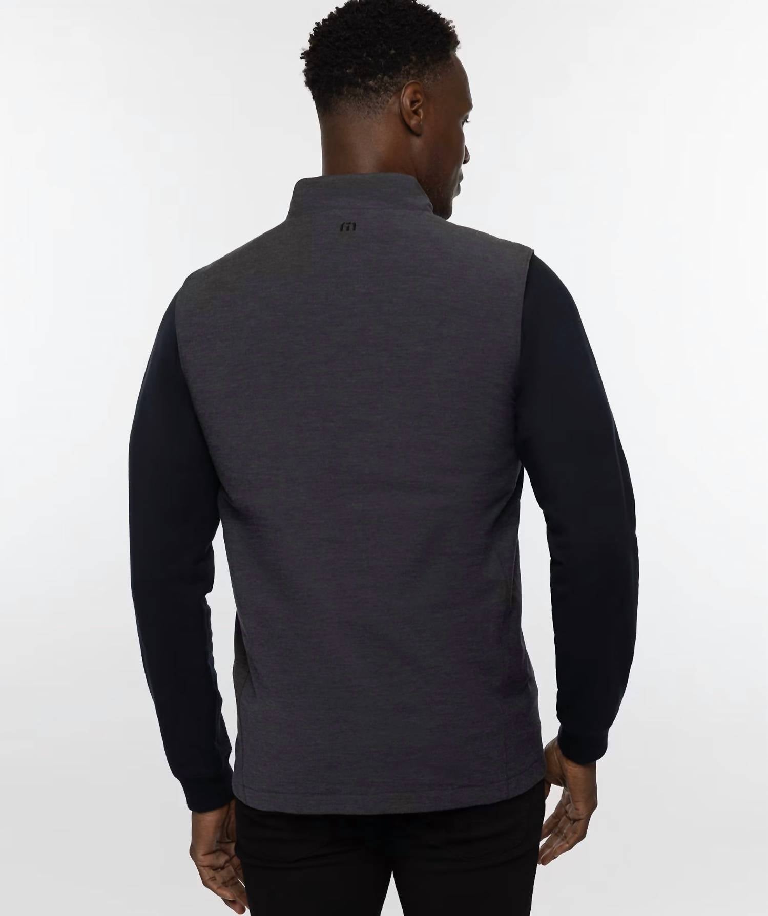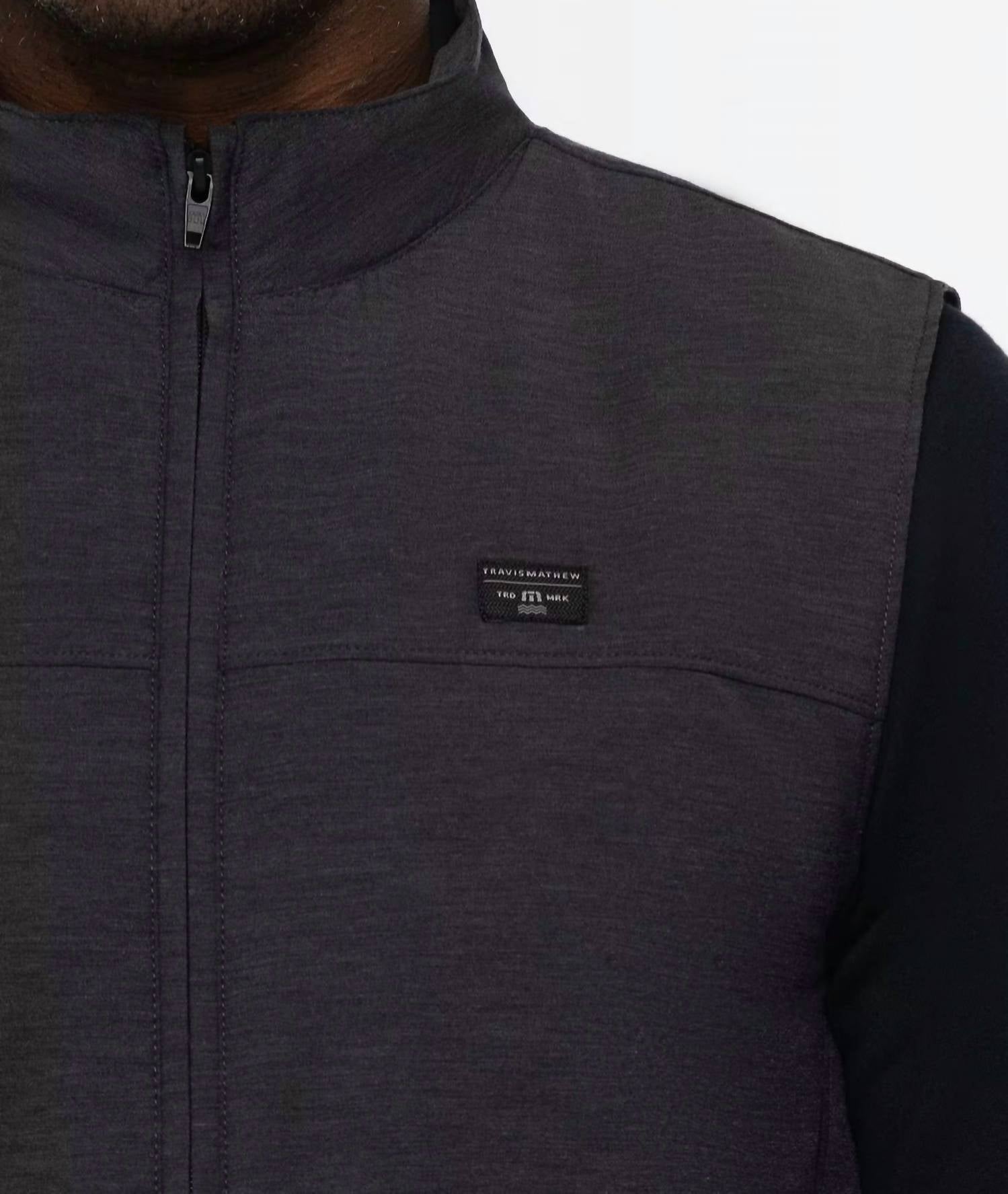 The Top of the Line Golf Vest by TravisMathew in Heather Black offers the ideal combination of style and function. As part of the Eco Collection, this sleeveless vest features a polyester, cotton, and spandex blend for comfortable movement and a lightweight poly fill for added warmth. It’s finished with a zip closure and front entry zipper pockets. The vest is imported and includes a woven label and printed logo on the back yoke for a touch of sophistication. Models are seen wearing a size M at an average height of 6'1" and weight of 180 lbs.