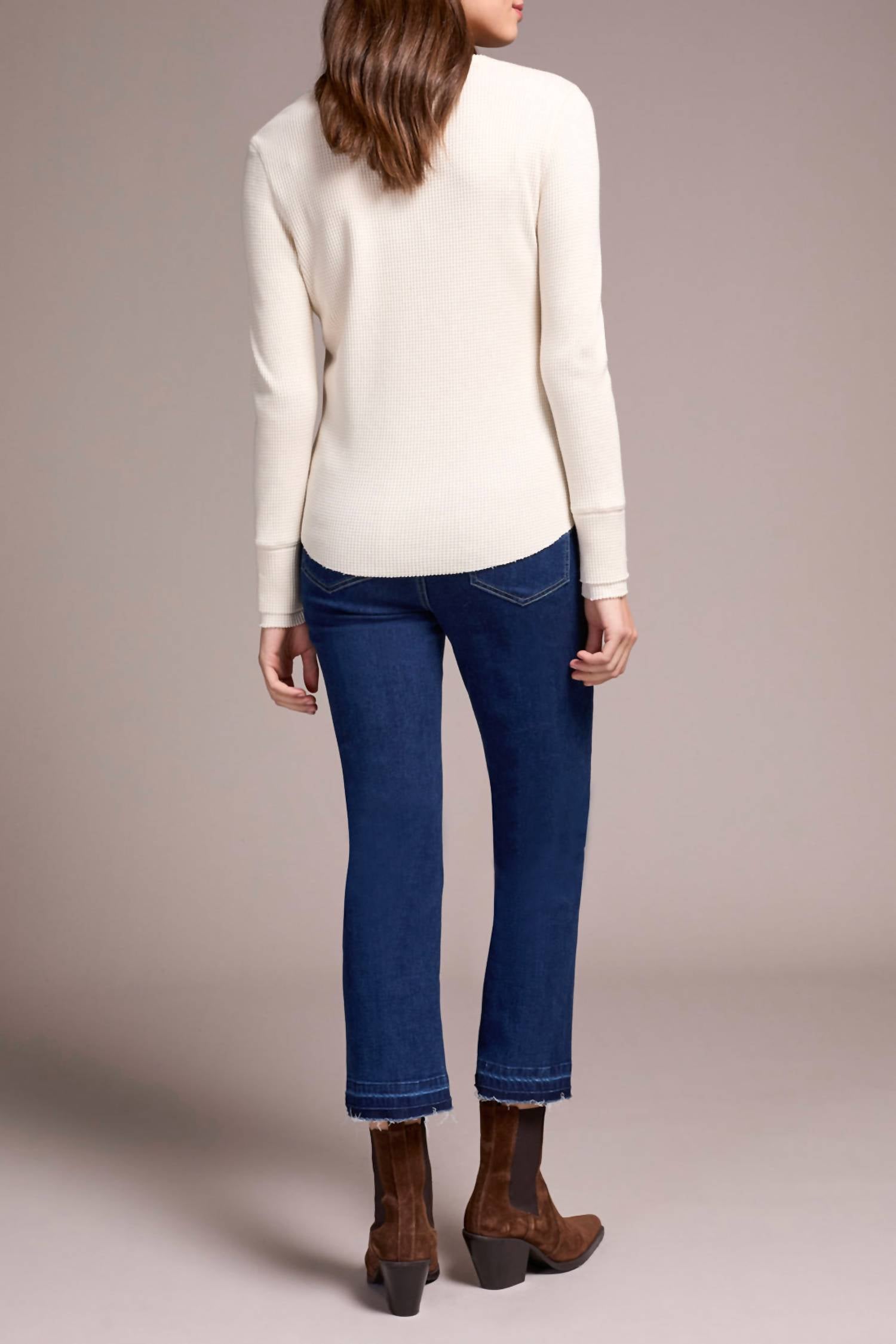 Wear this v-neck sweater with your favorite denim for the perfect fall look. Elevate your wardrobe with the TRIBAL Henley Top With Buttons, a chic and timeless piece in elegant H Eggshell. Featuring long sleeves and crafted from a premium blend of 53% Rayon, 34% Polyester, 9% Nylon, and 4% Spandex, this top ensures both comfort and style. Originating without a specified country, it comes with a convenient pull-on closure. For maintenance, machine wash on a normal cycle with cold water, avoiding bleach, and finish with a low tumble dry and iron if necessary.