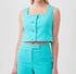 Show a little skin in this cute and casual crop top.This Refreshment 2 Top is a sleeveless, tailored crop top in a captivating shade. Featuring a square neckline, button-front closure, and textured 97% Cotton, 3% Lycra blend fabric, it offers breezy sophistication with accentuated stitching details. True to size and dry clean only.