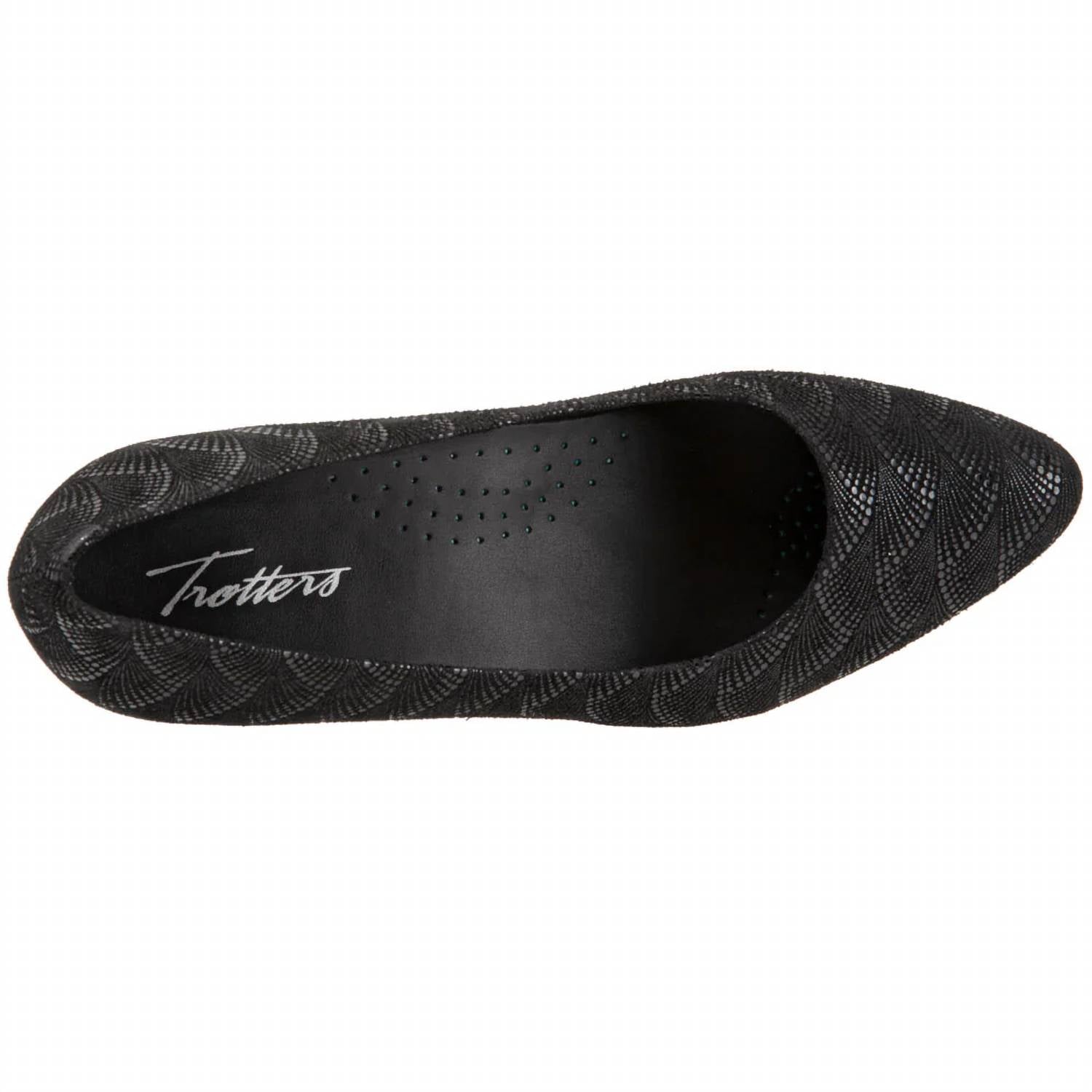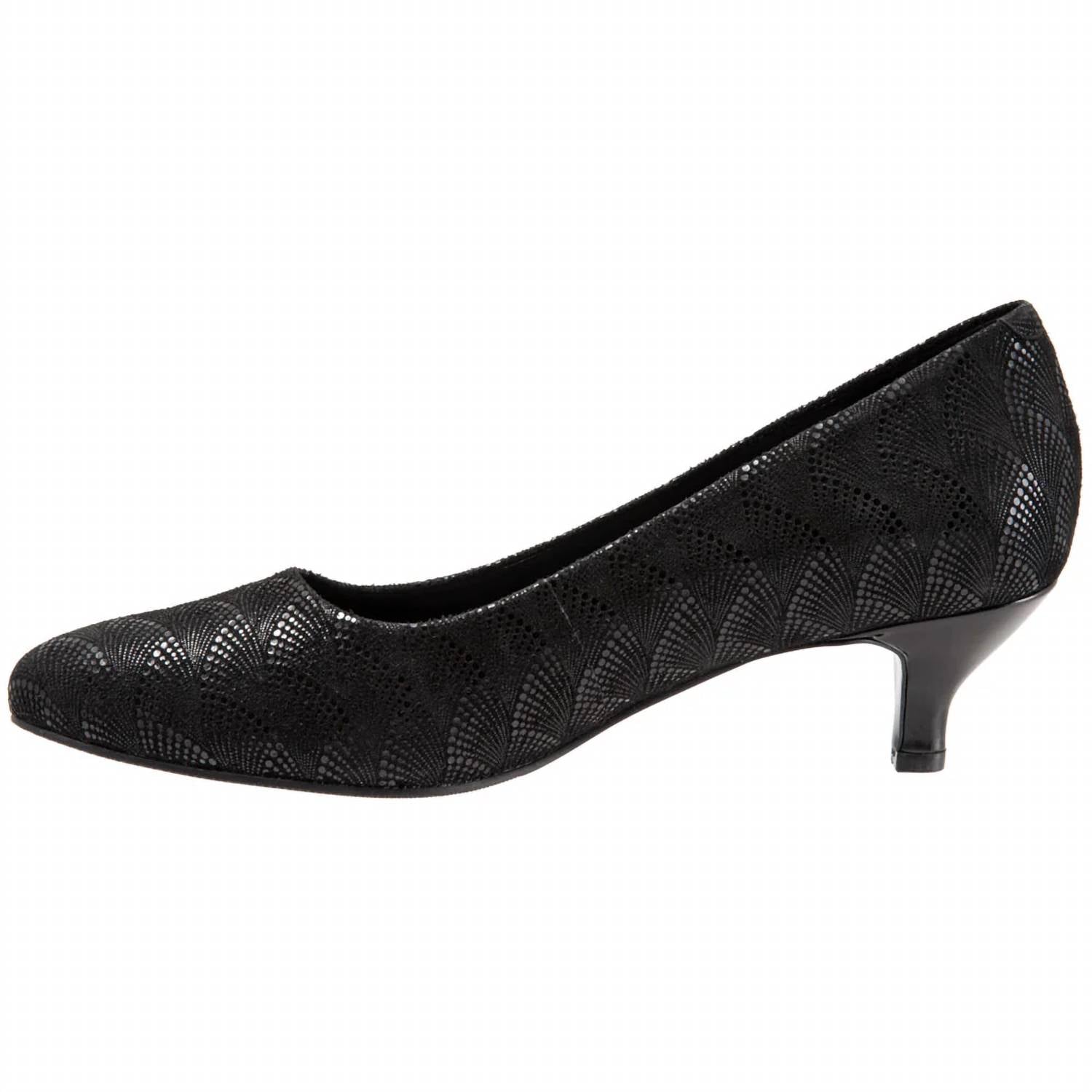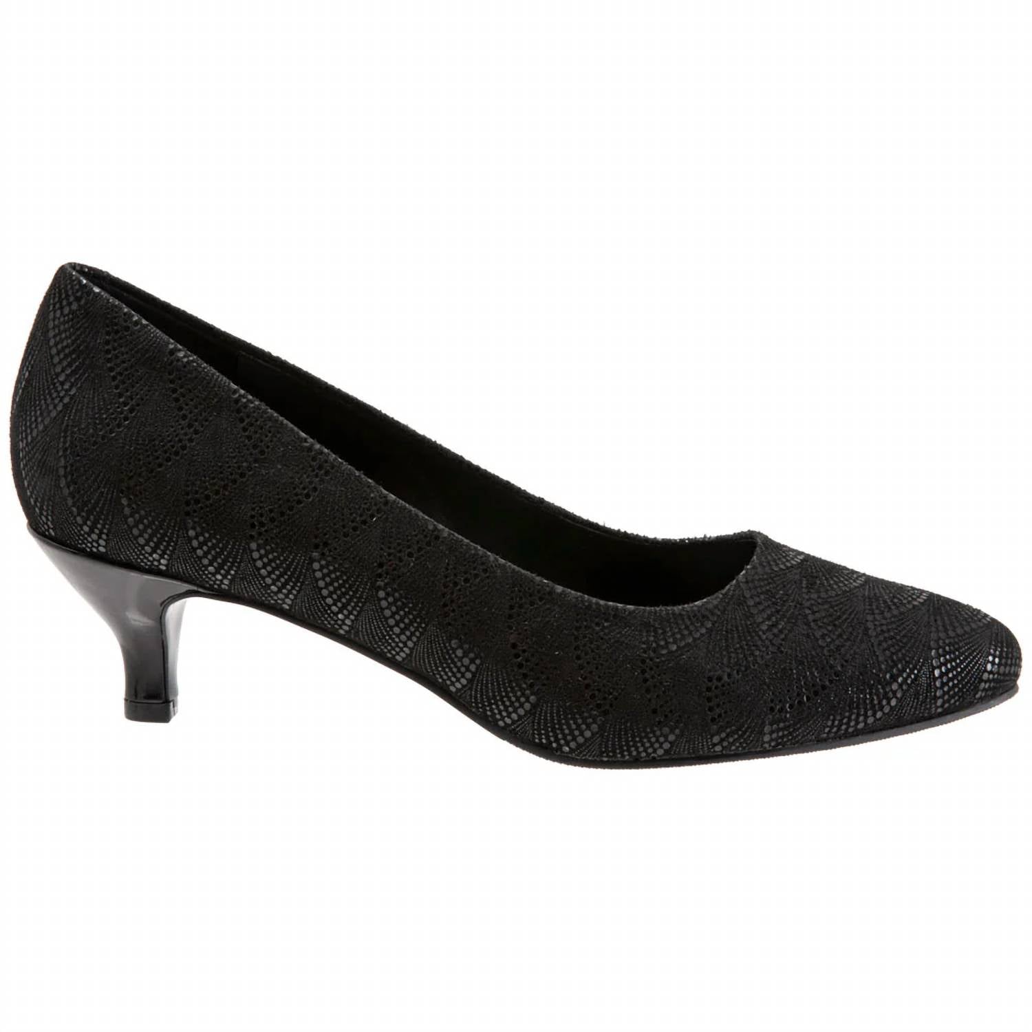 Introducing the Kiera Leather Heel by Trotters, a sophisticated choice with an elegant almond toe in chic Black Waves. This women's heel features a soft antimicrobial lined and cushioned insole and a removable cushioned footbed with arch support for enhanced comfort. The leather upper is complemented by a soft man-made Nappa lining, while a lightweight flexible rubberized sole supports the 2-inch kitten heel. Effortlessly stylish and designed for comfort, these heels are perfect for elevating any outfit.
