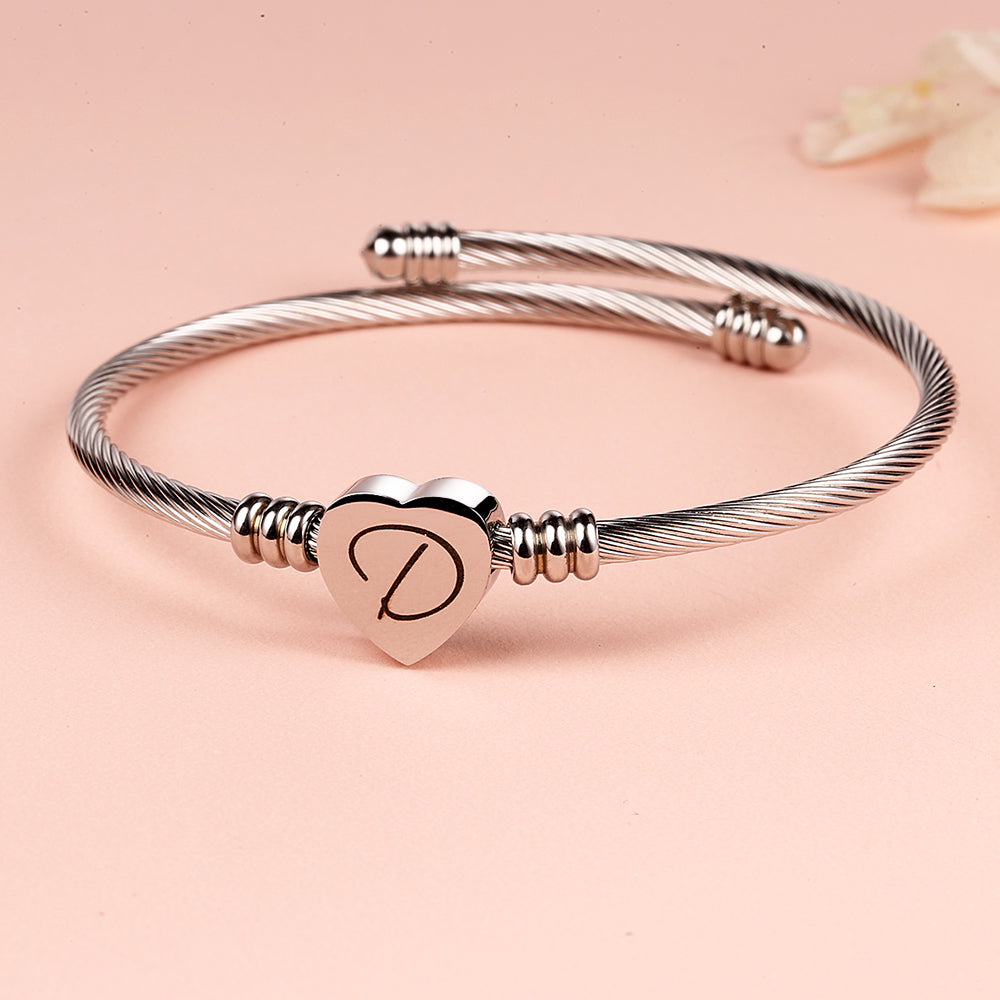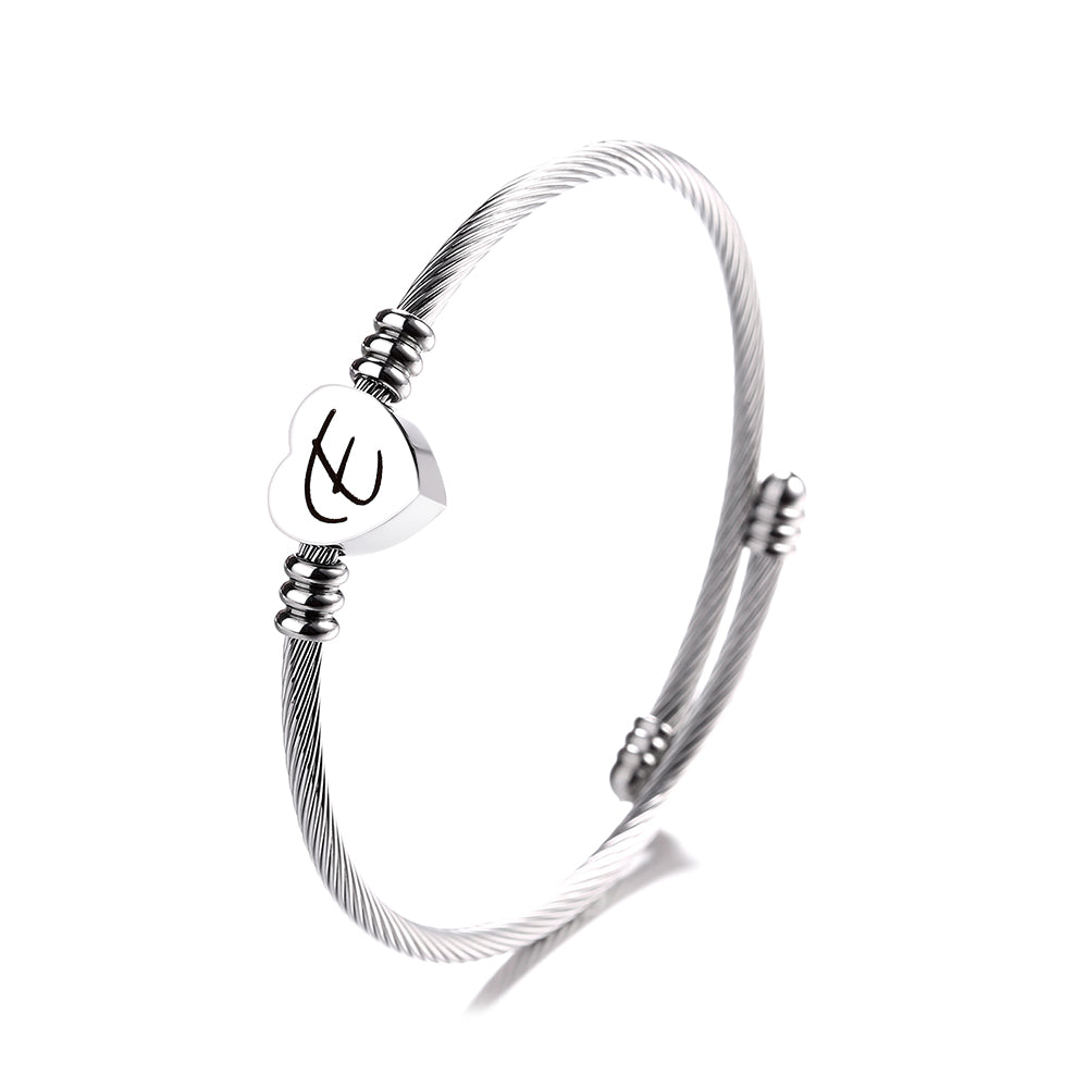 O pingente inicial é feito de aço inoxidável de alta qualidade, com acabamento polido que acrescenta beleza e brilho. O pingente em forma de coração também é feito de aço inoxidável e apresenta um design de cabo trançado que complementa o design geral da pulseira.