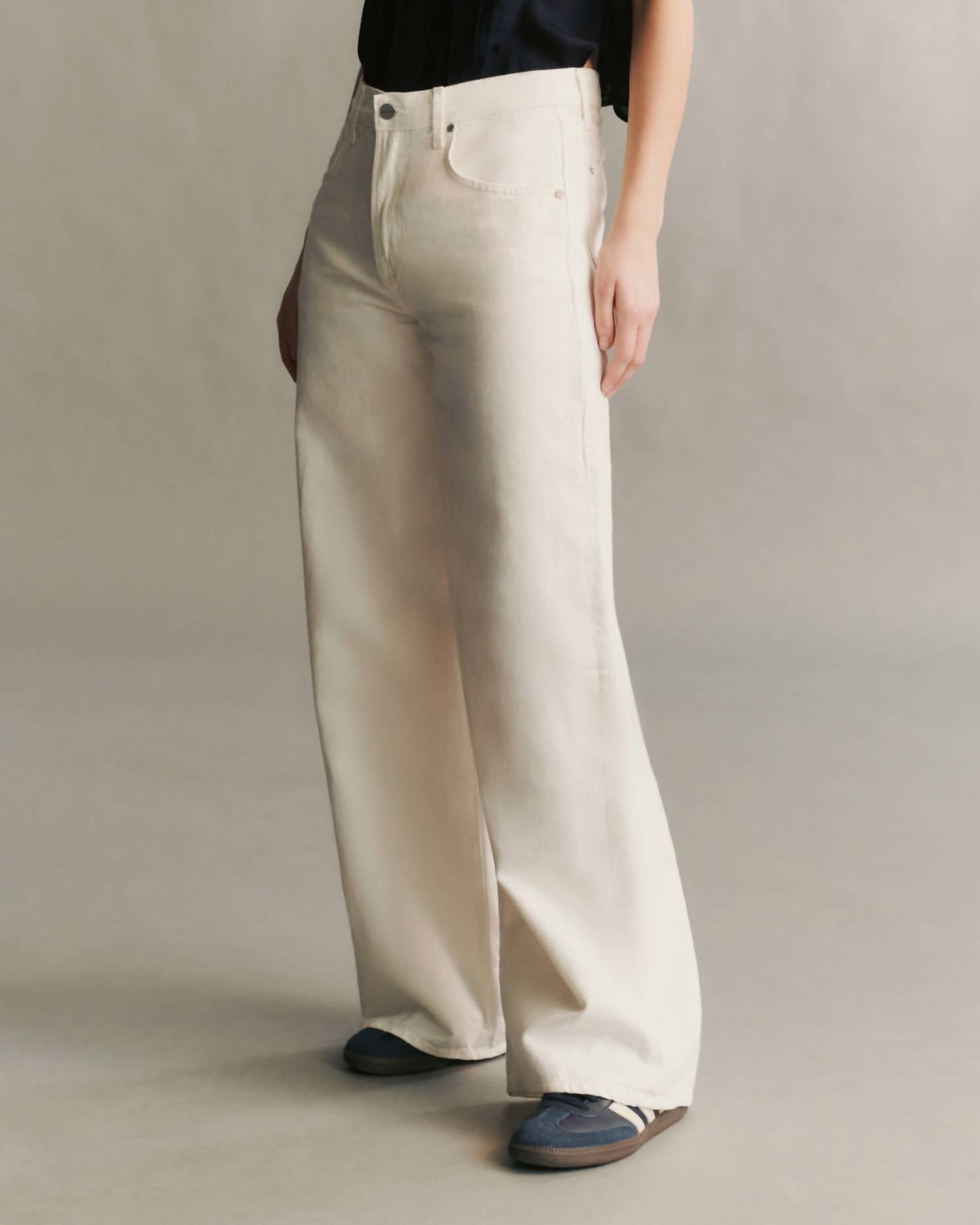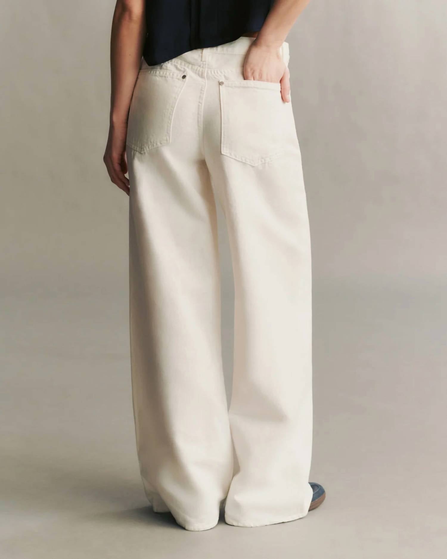 Pair these wide leg jeans with mules, slides or your favorite strappy sandals. TWP's Tiny Dancer Wide Leg Jeans, crafted in washed Japanese denim, are a must-have for your wardrobe. With a relaxed fit at the hip and a mid-rise design, these jeans feature a wide leg style for comfortable, everyday wear. Made from 100% cotton, they are finished with a classic five-pocket style, signature nail head rivet hardware, and a button closure. Care instructions include machine wash and tumble dry, making them easy to maintain.