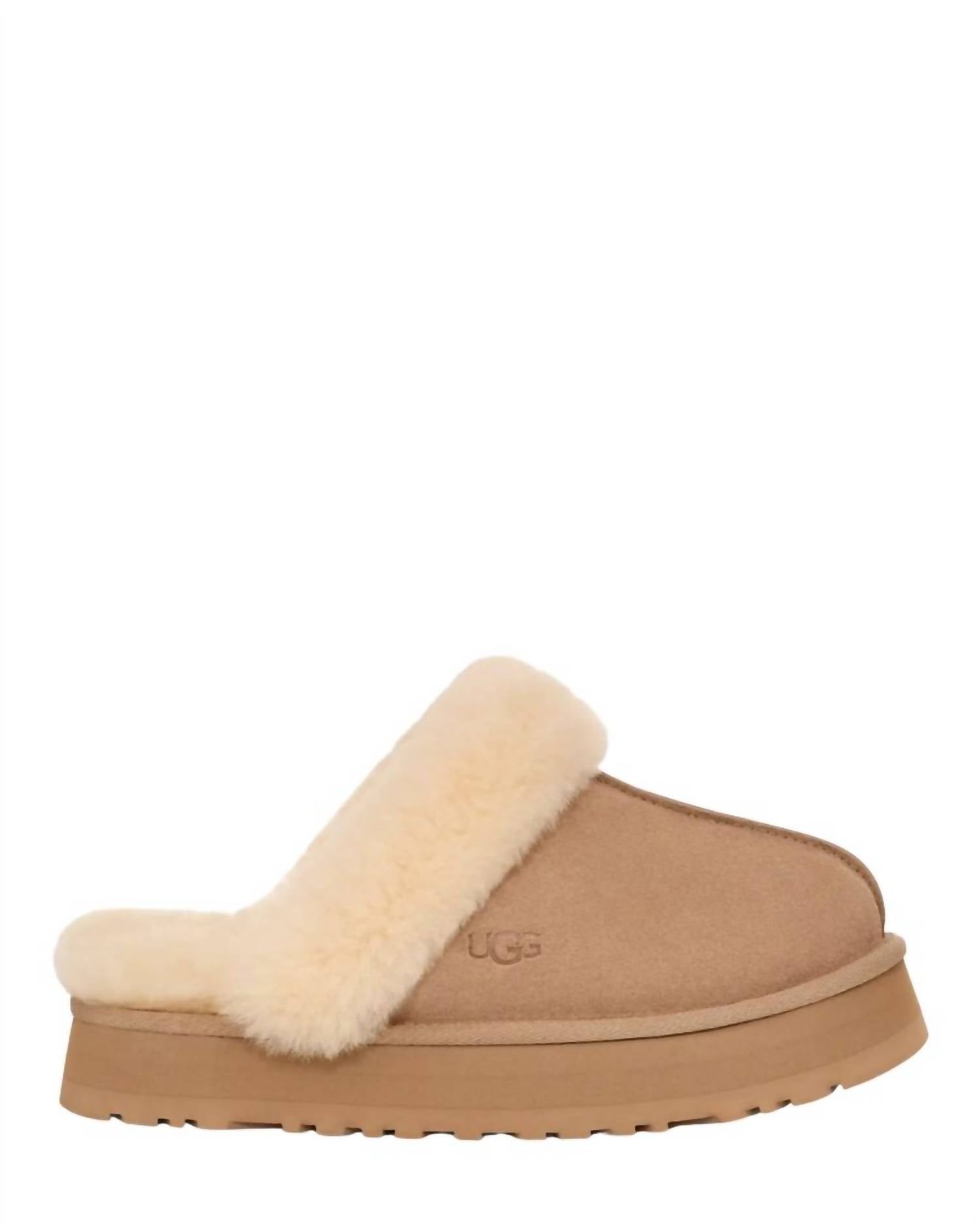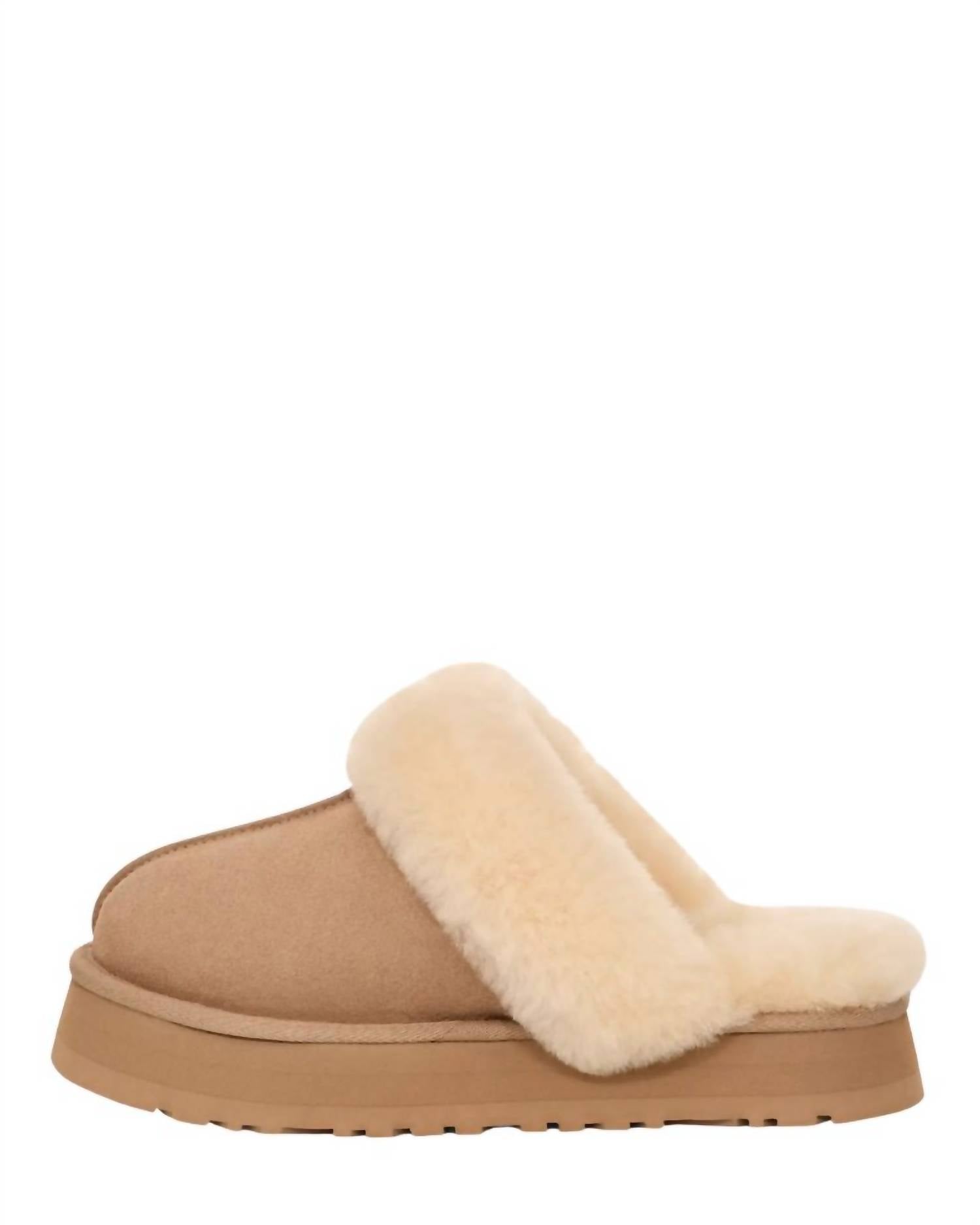 Combine-os com um robe aconchegante e chamaremos isso de roupa de dormir de luxo. O chinelo apresenta cabedal em camurça adornado com uma gola macia em pele de carneiro. Projetado com forro e palmilha em pele de carneiro de 17 mm para máximo conforto, ele também conta com entressola em EVA e solado em EVA Sugarcane ou Treadlite by UGG™ EVA para excelente suporte. O salto plataforma de 2,5 cm oferece um toque de sustentação, complementado por uma faixa têxtil feita com fibras 100% de poliéster reciclado.