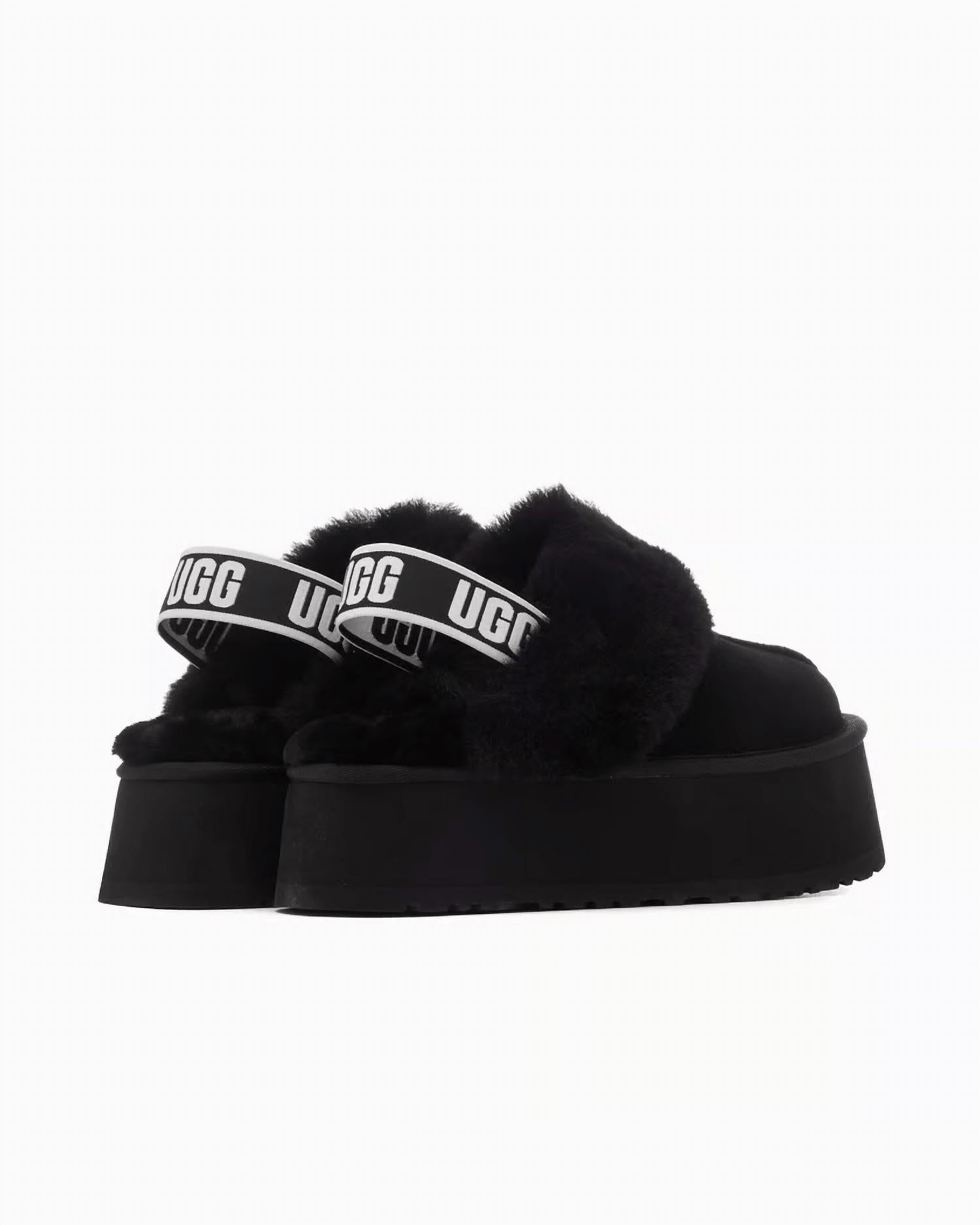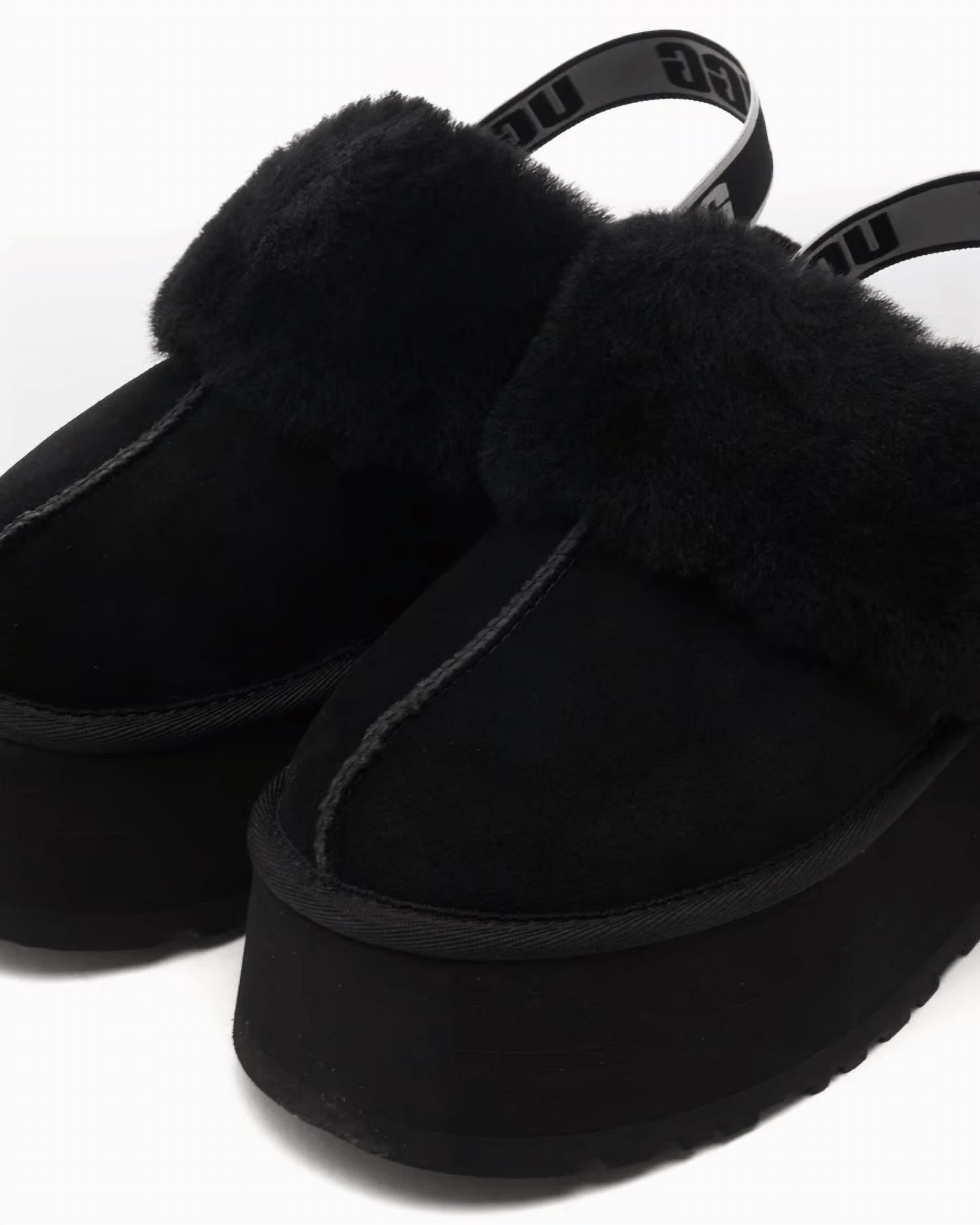 Tão confortável que é como se você estivesse andando nas nuvens. Eleve seu estilo casual com os chinelos femininos Funkette da UGG, com cabedal em camurça elegante e estiloso. Estes chinelos pretos possuem uma confortável gola em pele de carneiro e um forro em pele de carneiro de 10 mm para o máximo conforto. O destaque fica por conta do salto plataforma de 5 cm e da tira elástica com o logotipo da UGG, garantindo um ajuste seguro e um toque retrô. Escolha entre o solado ecológico SugarSole™ ou o resistente Treadlite da UGG™ e desfrute de um toque de luxo com os detalhes da etiqueta tecida.