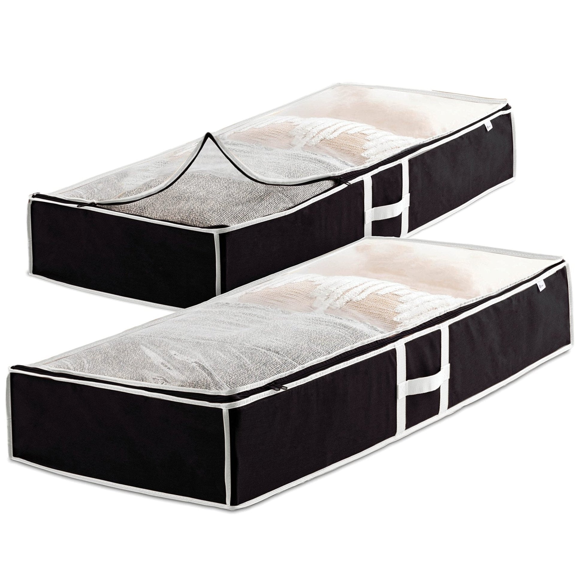 - DESIGN CUIDADOSO - Nosso conjunto de caixas para guardar roupas possui uma alça reforçada para facilitar o manuseio e o deslizamento sob qualquer cama. A tampa de plástico transparente garante que você nunca perca o controle do que está dentro.
