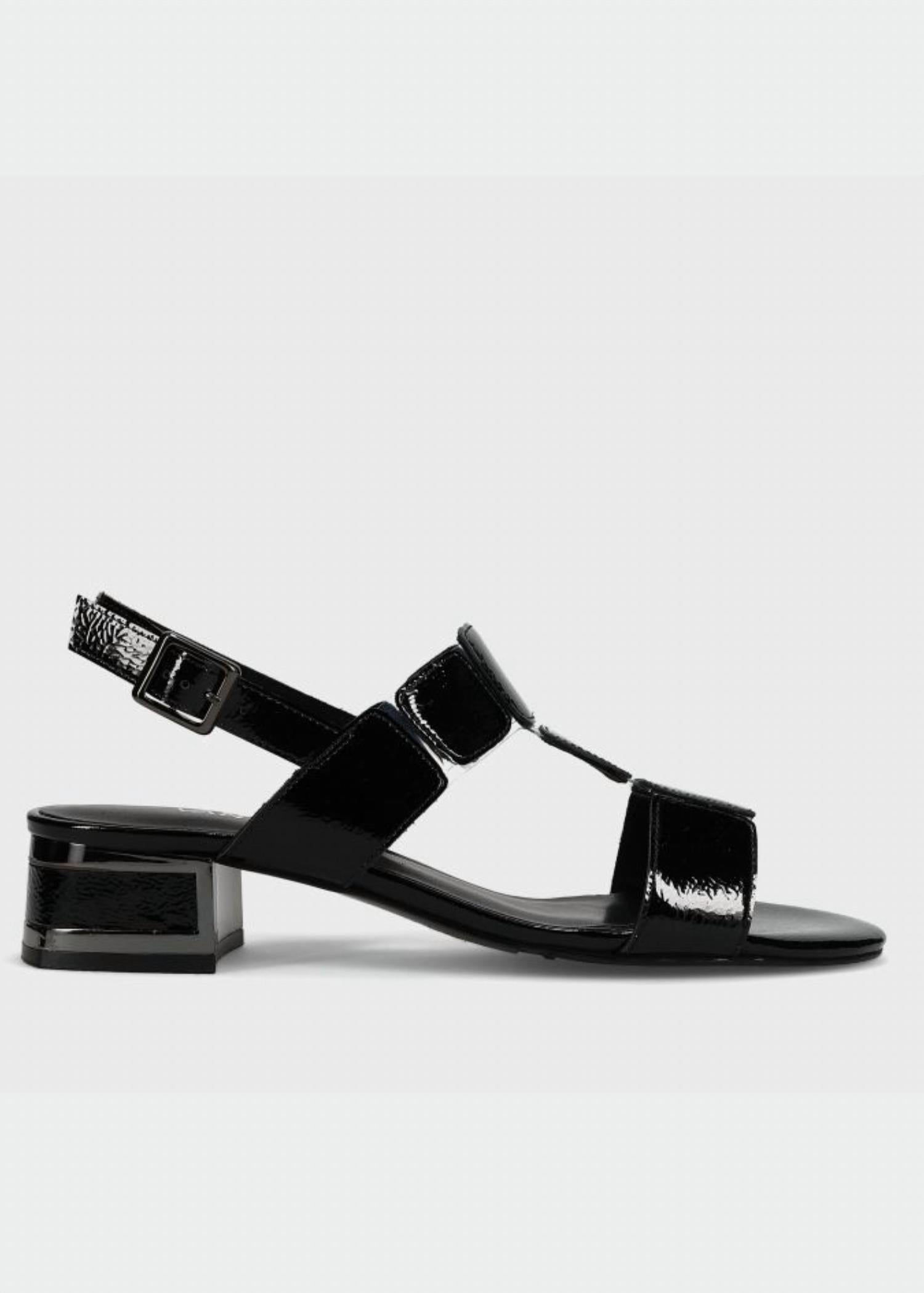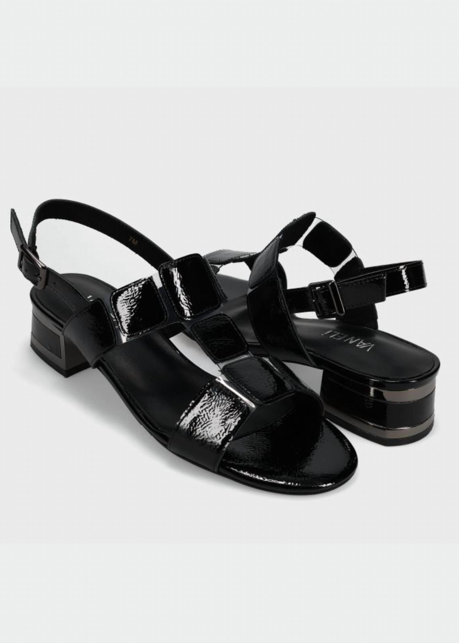 Step into style with the Women's Hatty T Strap Sandal by VANELi, a chic addition to your summer wardrobe in sleek Black Naplak. Crafted from glossy patent leather, these sandals feature a T-strap design with an illusion vinyl finish and an open toe, offering a minimalist yet elegant look. The 1.5-inch block heel is covered with metallic trim for an added touch of sophistication, while a hidden elastic insert in the buckle ensures a comfortable fit. These sandals prioritize comfort with a padded insole, perfect for all-day wear.