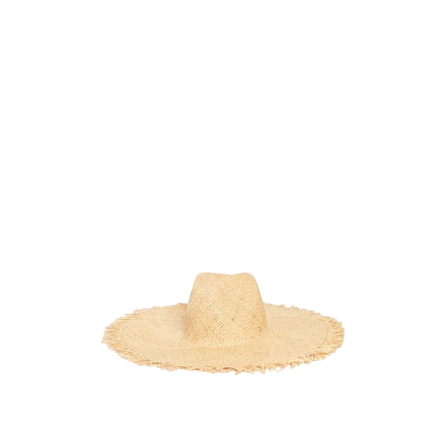 Chapéu de ráfia natural, fabricado na Itália, com aba larga para proteção solar. O material principal é 100% ráfia. Instruções de cuidado: Não lavar na máquina, secar na secadora, passar a ferro ou usar alvejante. Referência: 4EVM04-V72024-124.