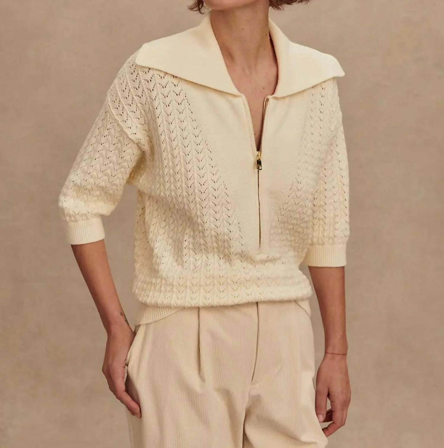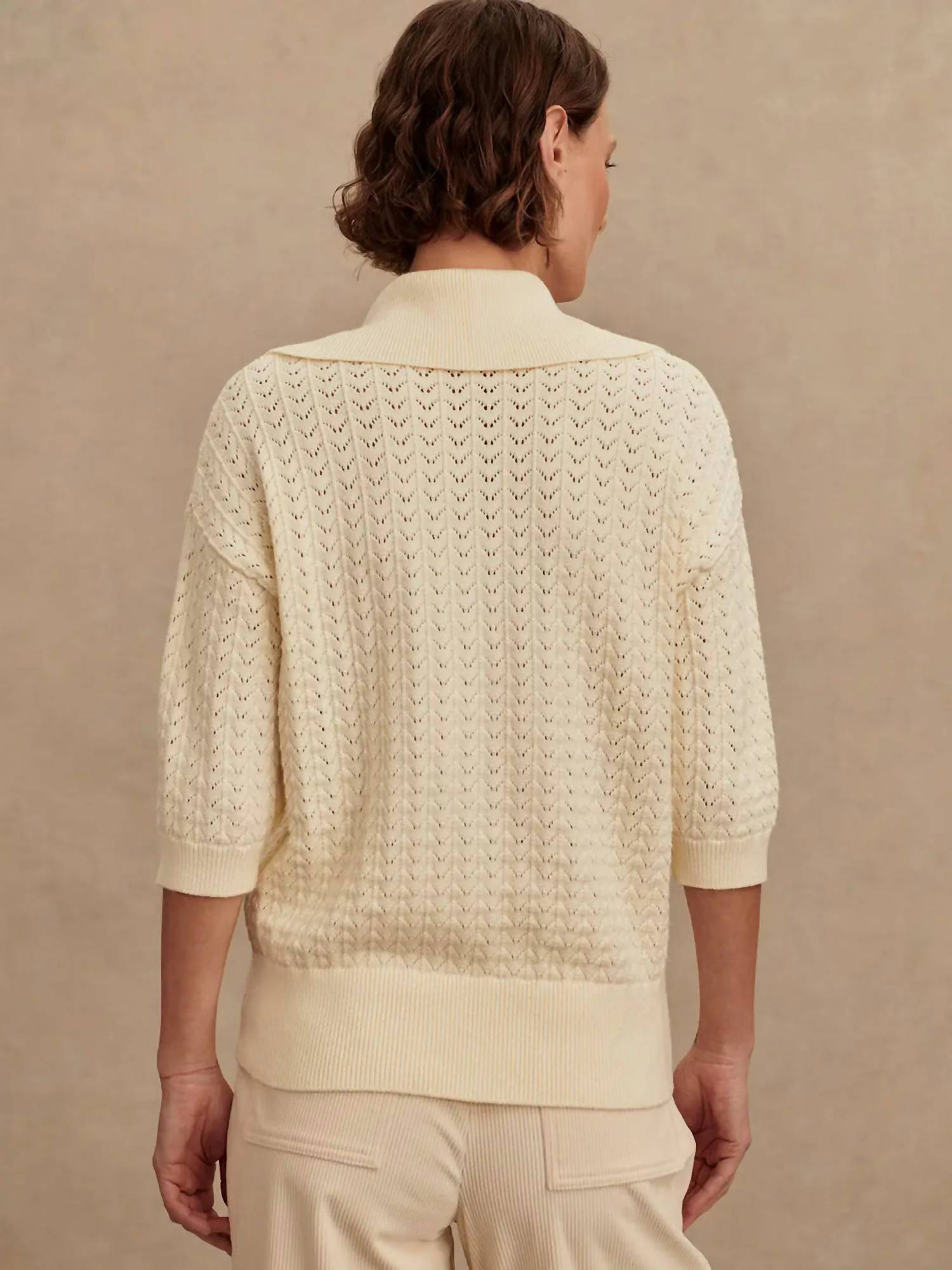 Pair this with your favorite jeans and slides for your next girls night out. Elevate your transeasonal wardrobe with the Arney Half Zip Knit Polo by VARLEY, a textured short sleeve piece in a sophisticated Egret hue. Crafted from a premium blend of 42% Viscose, 30% Polyester, 20% Nylon, and 8% Lyocell, this minimalist polo offers both style and comfort. Designed with a collar neckline and a unique tie closure, it's perfect for vacation looks. Care for this women's activewear by machine washing and laying flat to dry.