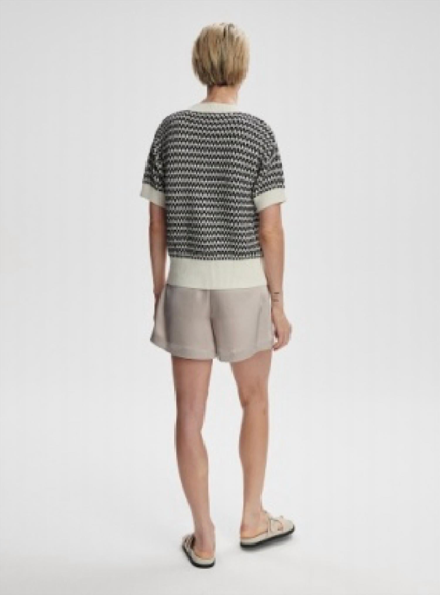 Introducing the Dora Knit Top by Varley, a stylish addition to your summer wardrobe in an elegant Egret hue. This women's blouse features short sleeves and a flattering V-neckline, perfect for holiday parties and casual outings alike. With a pull-on closure and a chic patterned design, it seamlessly blends comfort and style. Make a statement this season with this must-have piece.